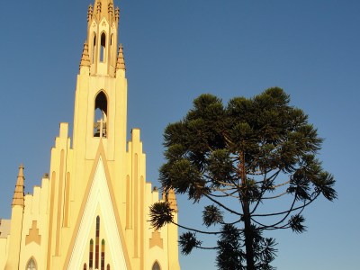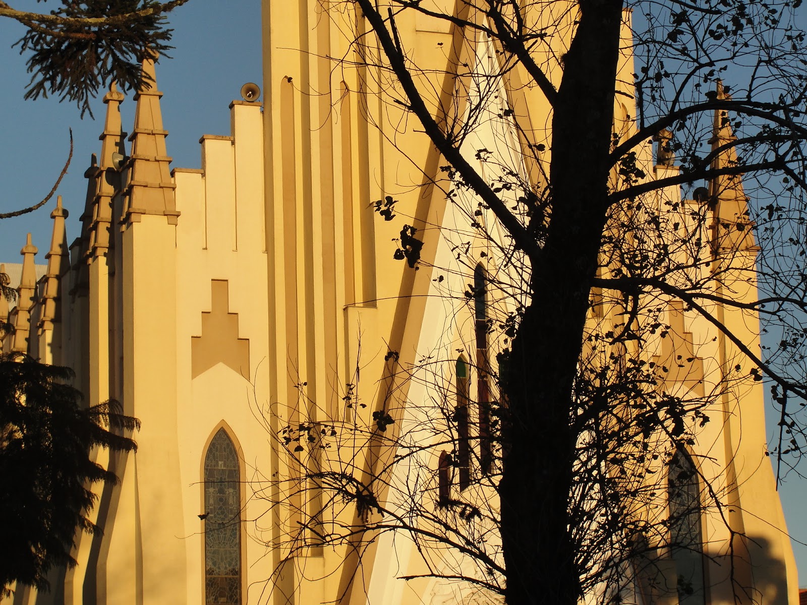 Atrás dos traços das árvores da praça, a fachada da Igreja Cristo Rei, banhada pelo entardecer do outono, adquire uma intensa cor alaranjada. Com 40 metros de altura, não é difícil de encontrá-la em Bento Gonçalves junto a praça das rosas, bem perto da antiga estação de trem.Construída em estilo gótico nos anos 50, possui três altares em seu interior além de obras do escultor alemão Alfredo Staege. É dele uma pia com fonte da água benta, sustentada por anjos, localizada em um dos lados da nave. O seu formato triangular, parece apontar para o céu… Como a araucária da praça…
