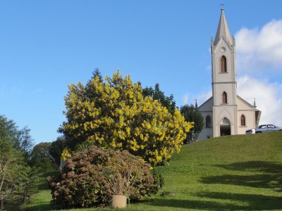 Sempre é bom subir a serra, principalmente no coração do turismo gaúcho que é a nossa Gramado. Mesmo depois do festival ou antes do natal (com ou sem Luz), ainda tem um frio (e quem sabe neve) para curtir. E a primavera já está logo ali, e também se mostra por lá. Pois um dos muitos caminhos que levam a região (RS115), está bloqueado e rotas alternativas estão sendo apresentadas pela grande imprensa, sendo uma ótima oportunidade para conhecer novas paisagens. Quem vai por Santa Maria do Herval e depois pega a estrada da serra grande, não pode deixar de reparar nesta simpática igrejinha evangélica na estrada “a esquerda de quem sobe, uns quatro quilômetros depois”, na localidade de Boa Vista do Herval. A própria cidade que faz parte da Rota Romântica, possui outros atrativos como cascatas, outras igrejas, vales, montanhas, caminhos…. Há muito mais a ver no Rio Grande. Basta se aventurar um pouquinho. Afinal, são só quatro quilômetros de chão até a igreja e mais vinte até a entrada de Gramado (passando por outra igreja em Alto Padre Eterno que ficamos devendo a foto). Sempre acompanhado de belas paisagens serranas, é claro.