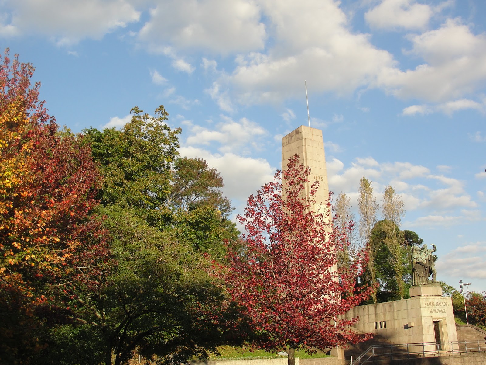 É bem ali em uma das esquinas mais movimentadas da Caxias, que se percebe a chegada do Outono. O fim de tarde da metrópole da serra itálica, ganha outros contornos naquele ponto, inundando espíritos dos que ampliam o olhar para além do trânsito e do relógio.Os tons do amarelo ao vermelho emolduram o monumento ao imigrante. E as espécies que trocam radicalmente de cor nesta época, assistem em silêncio os passantes indo para casa, passando direto pela cidade, ou mesmo dobrando para uma aula da universidade ali perto. Um cantinho simples, mas com algo para mostrar.