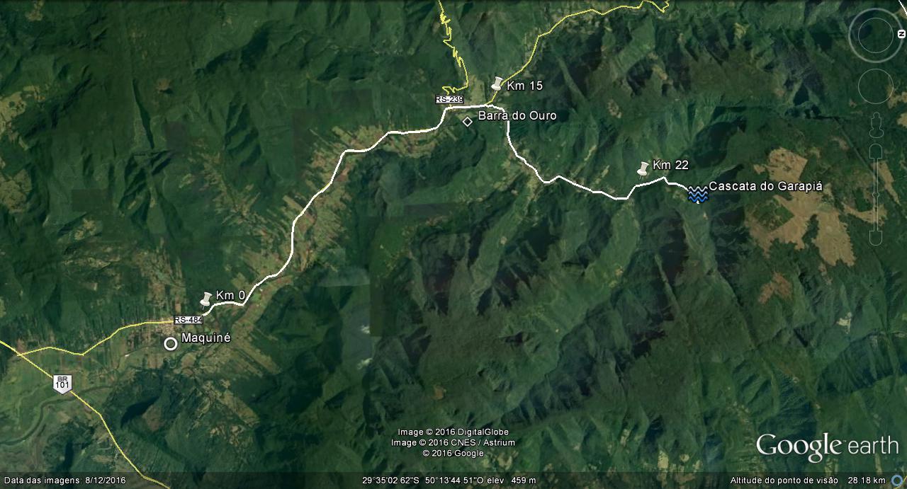 Pela BR 101 chega-se a entrada do município de Maquiné. A partir desta pequena cidade de pouco menos de 7.000 habitantes, chega-se por estrada de chão a um de seus distrito: Barra do Ouro. A partir daí são mais 7 Km de trecho sem asfalto de um belíssimo vale, recheado de paisagens exuberantes. Durante o trajeto total de 22 Km, cruza-se por vezes os rios Maquiné e Garapiá em rasas pontes de concreto onde a água passa por cima, formando fina lâmina d’água. Por isso recomenda-se ficar atento a possíveis chuvas fortes que possam dificultar a viajem. Chegando no lugar, a caminhada até o esverdeado lago formado pela queda é curta e leve, facilitando a apreciação deste recanto especial…
