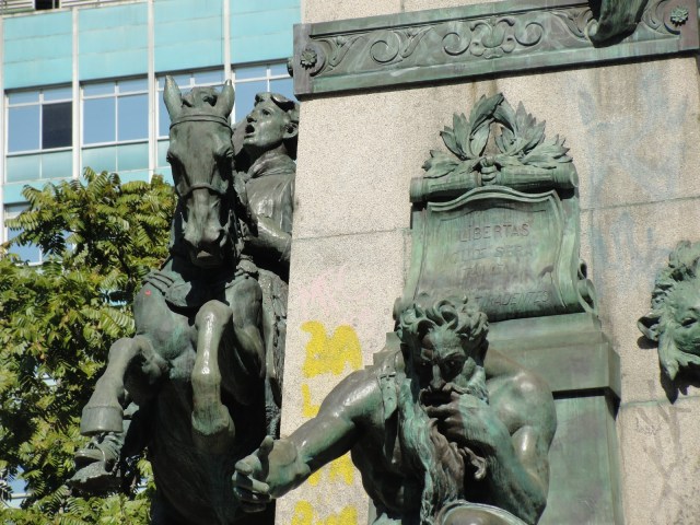 Júlio de Castilhos foi este homem que governou os gaúchos com força e determinação, sendo reverenciado pelos amigos e odiado pelos inimigos. Aplicador do positivismo de Augusto Comte esteve à frente do poder no alvorecer do século XX até falecer em 1903, sempre propondo uma república baseada em aspectos racionais relacionados às ciências e a história. Foi com estas ideias que redigiu praticamente sozinho a constituição estadual de 1891 que serviu de base para muitas outras da nação brasileira. Entretanto esta pioneira carta, foi por muitos, considerada autoritária, chegando-se a dizer que seu autor teria “inventado” a ditadura. Divergências e reflexões políticas a parte, o personagem sobreviveu e deixou suas marcas como o imponente monumento erguido em sua homenagem, onde está placidamente sentado rodeado de elementos simbólicos que ajudam a entender o que ele representa. Algo que ainda mostraremos mais com as devidas reflexões. Sempre necessárias….