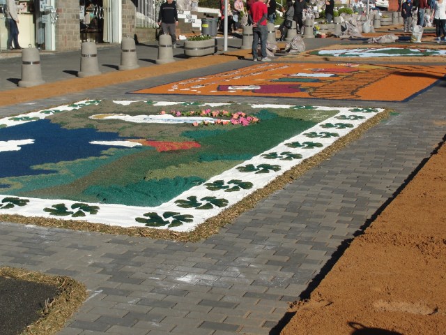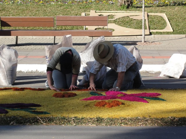Para celebrar a fé católica, a procissão de Corpus Christi caminha todos os anos sobre belos mosaicos de serragem colorida. E nesta cidade de origem italiana, a mobilização da comunidade para enfeitar as ruas que circundam sua caprichada praça central, é um momento único. Gentes de todas as idades e jeitos dedicam paciência na colocação de pós, grãos ou mesmo de outros materiais complementares como tampas de garrafa, para criar cenas e homenagens. Lá estão os motivos sacros, mas também os culturais e históricos, incluindo a sempre presente saga da imigração. Ontem fizemos uma transmissão ao vivo em nossa página no Facebook, trazendo em tempo real o trabalho intenso para produzir beleza ao ar livre. Hoje colocamos algumas imagens e já estamos preparando um vídeo. Para que aos que não vão até lá, possam apreciar o tocante espírito de dedicação a um objetivo, proporcionado por uma pujante comunidade.