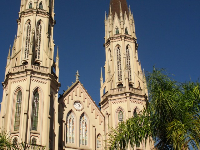 Localizada em Santa Cruz do Sul, é uma das maiores em estilo gótico das Américas, e com suas duas torres de mais de 80 metros de altura se impõe na paisagem urbana. A riqueza de detalhes, do chão ao topo, impressiona a todos que tem oportunidade de apreciá-la. Seja bem de perto, ou de longe usufruindo da ampla praça em frente. Seu interior não é menos rico, com magníficos vitrais que remetem a cenas religiosas e as missões do noroeste gaúcho. Sua construção substituiu a antiga sede da igreja católica que ficava em frente, demolida após a conclusão da nova, por volta de 1940. As altas torres, no entanto, foram finalizadas somente na década de 70, e são vistas de vários pontos desta pujante cidade de origem germânica no Vale do Rio Pardo. Como característico em cidades desta corrente migratória, os luteranos não ficaram para trás e também construíram outra bela igreja que ainda será mostrada aqui. E com este estilo gótico há ainda, uma igreja bem semelhante a esta em Venâncio Aires (cidade próxima a Santa Cruz do Sul) e em Novo Hamburgo. Ao menos no que consta a este que escreve. O certo é que há muitas belezas erguidas em nome da fé no Rio Grande do Sul, e que ainda serão faladas, fotografadas e filmadas. Pra trazer pra ti, é claro…