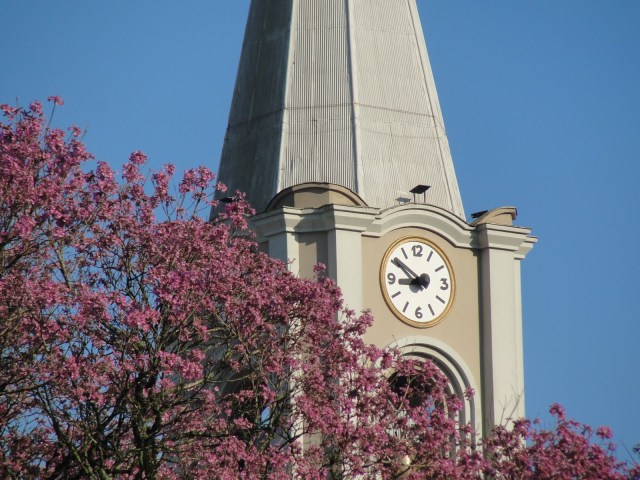 Uma série com 4 postagens com torres de igrejas de uma parte da serra gaúcha, acompanhadas de árvores floridas para a primavera, depenadas com o fim do inverno, ou mesmo somente com suas folhas verdes e formas singulares. A de Carlos Barbosa recebe o aconchego do ipê rosa e de dois pinheiros, conforme o ângulo escolhido para captar a imagem. Construída em 1947, a Igreja Nossa Senhora Mãe de Deus fica no centro desta pequena cidade de origem italiana. O inverno mais quente permitiu a floração antecipada deste tipo de ipê conforme já mostramos nesta outra postagem de Porto Alegre, que tu confere neste link aqui. Apreciar estes espetáculos que se conjugam beleza natural e construída, é talvez o motivo principal que nos leva a viajar. E tem muito mais pra ti na sequência da série em Garibaldi, Veranópolis e Cotiporã. É claro que ainda mostraremos de outras cidades. E faremos outras séries….