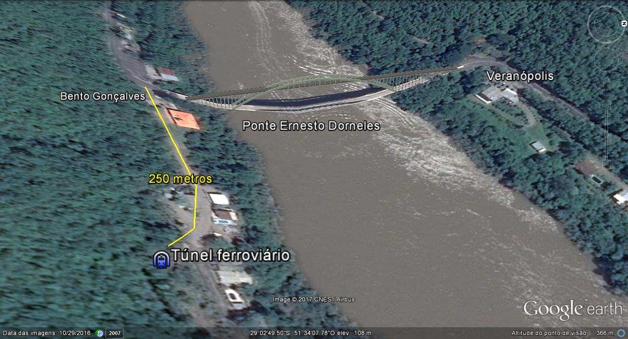Dividindo Bento Gonçalves e Veranópolis a Ponte Ernesto Dorneles sobre o Rio das Antas é uma das grandes obras de engenharia do Rio Grande do Sul, e uma das maiores pontes em arco do mundo. Aberta o tráfego em 1952 seu elegante formato chama a atenção dos que passam por ali em ambas as direções. Mas quem enfrenta as sinuosas curvas que antecedem a belíssima travessia, talvez não conheça outra interessante estrutura bem ali perto… A saída de um túnel ferroviário na margem esquerda do rio é um lugar que merece atenção pela aura de mistério que ronda este outro tipo de obra. Abaixo do símbolo da engenharia do exército gravado na parede está a infinita escuridão e sua sensação de medo… Afinal, a luz do fim só é acessível aos condutores dos poucos trens de carga que ainda circulam por ali. Chegar até a boca é fácil, mas é claro que se aventurar escuridão adentro seria uma proibitiva imprudência…