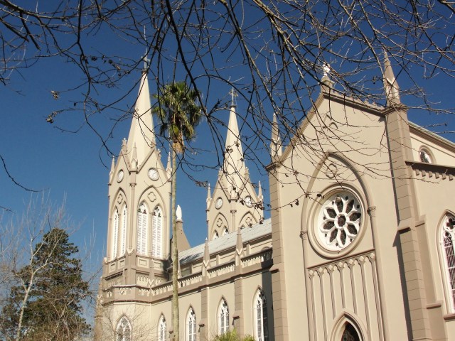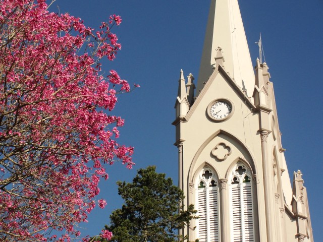 Uma série com 4 postagens com torres de igrejas de uma parte da serra gaúcha, acompanhadas de árvores floridas para a primavera, depenadas com o fim do inverno, ou mesmo somente com suas folhas verdes e formas singulares. A Matriz São Luiz Gonzaga não teve vida fácil na sua construção em demorados 23 anos, até sua conclusão em 1933. Mas suas duas torres em estilo gótico se impõe nesta pujante cidade serrana. Os ipês rosa lhe fazem companhia assim como a galhada fina de árvore que em outras épocas se preenche com belas e únicas folhas embranquecidas… A praça que lhe faz companhia não poderia deixar de ter uma academia da melhor idade ao ar livre. Nada mais adequado para a cidade considerada a campeã da longevidade…