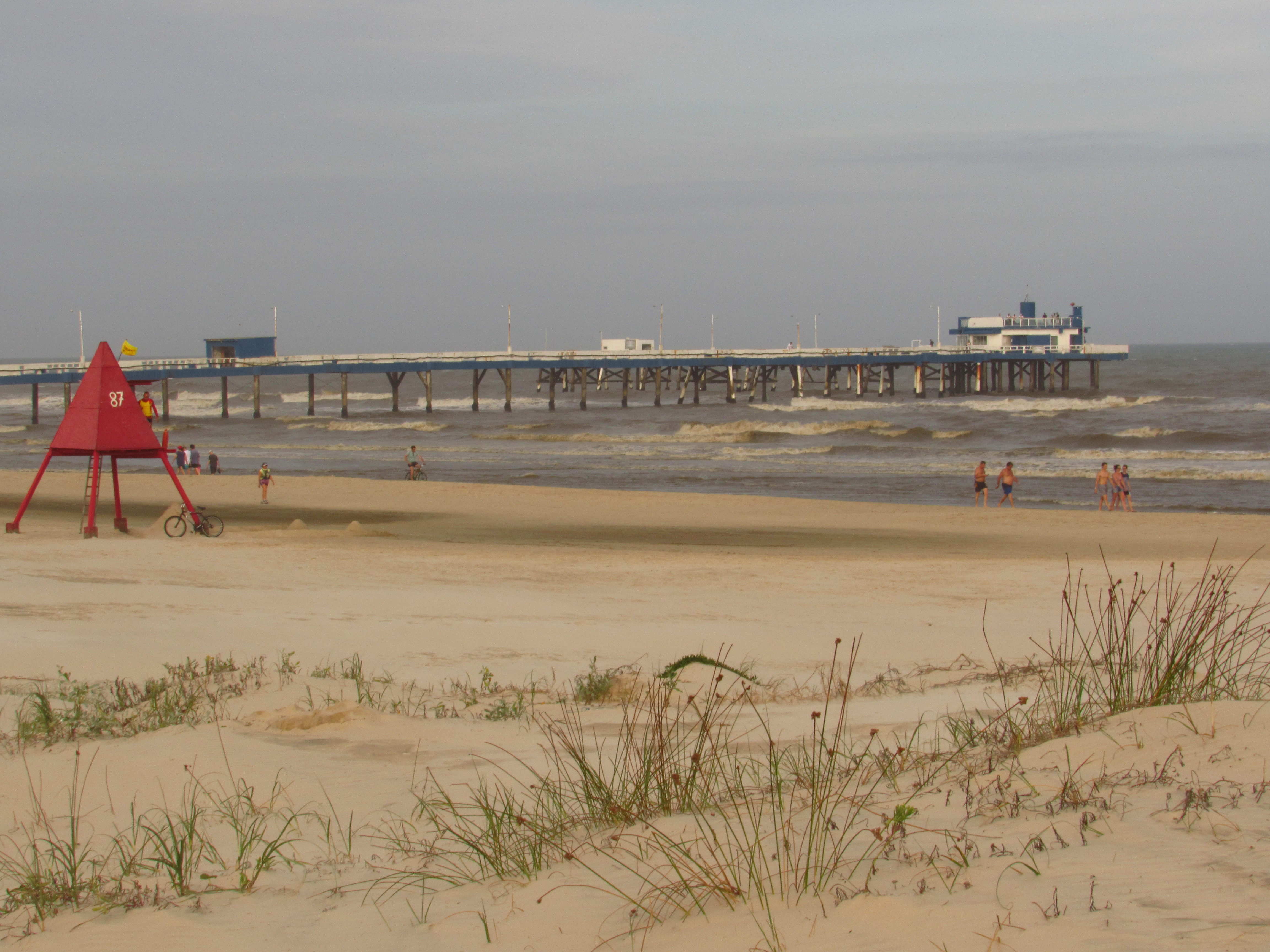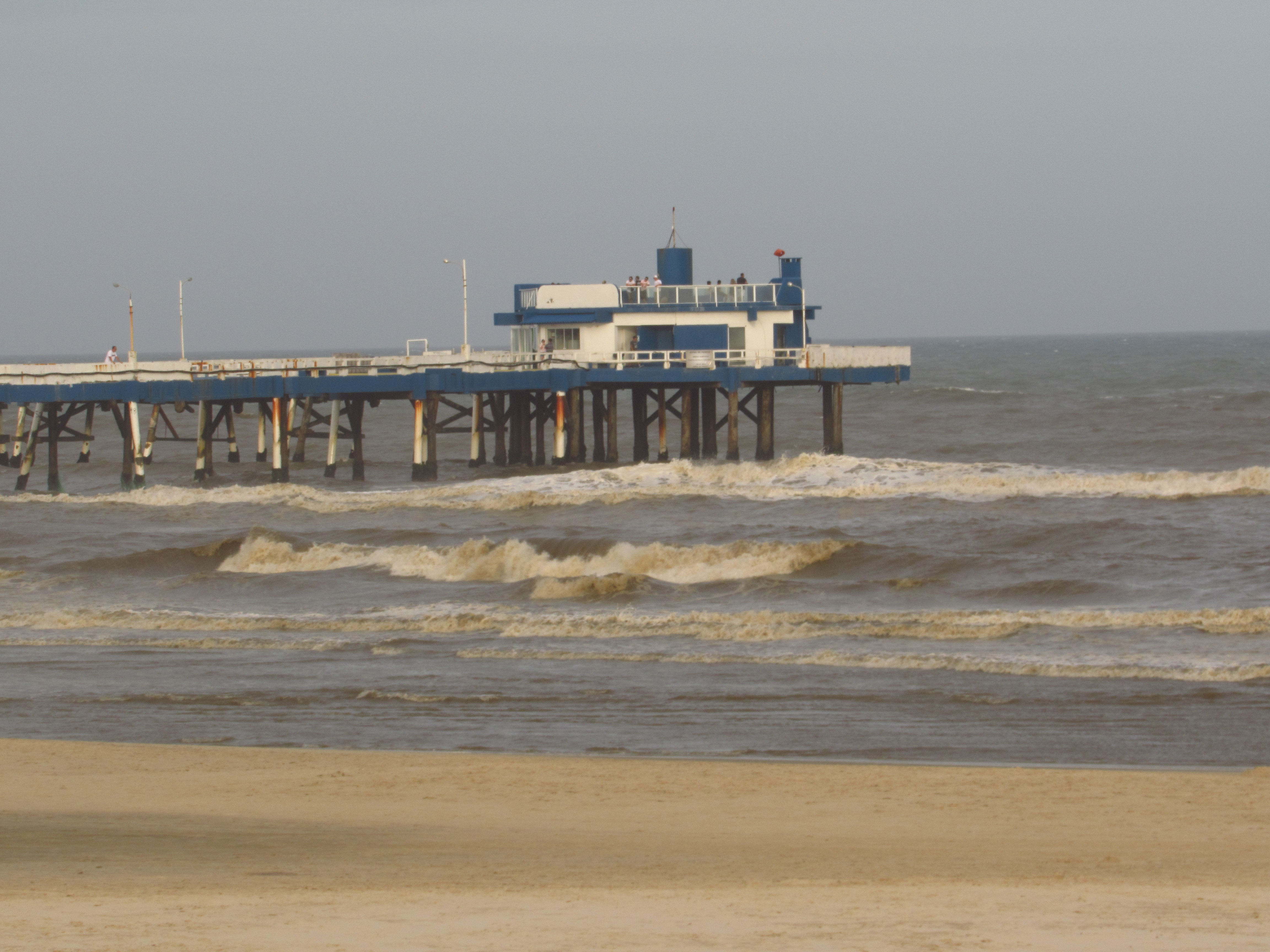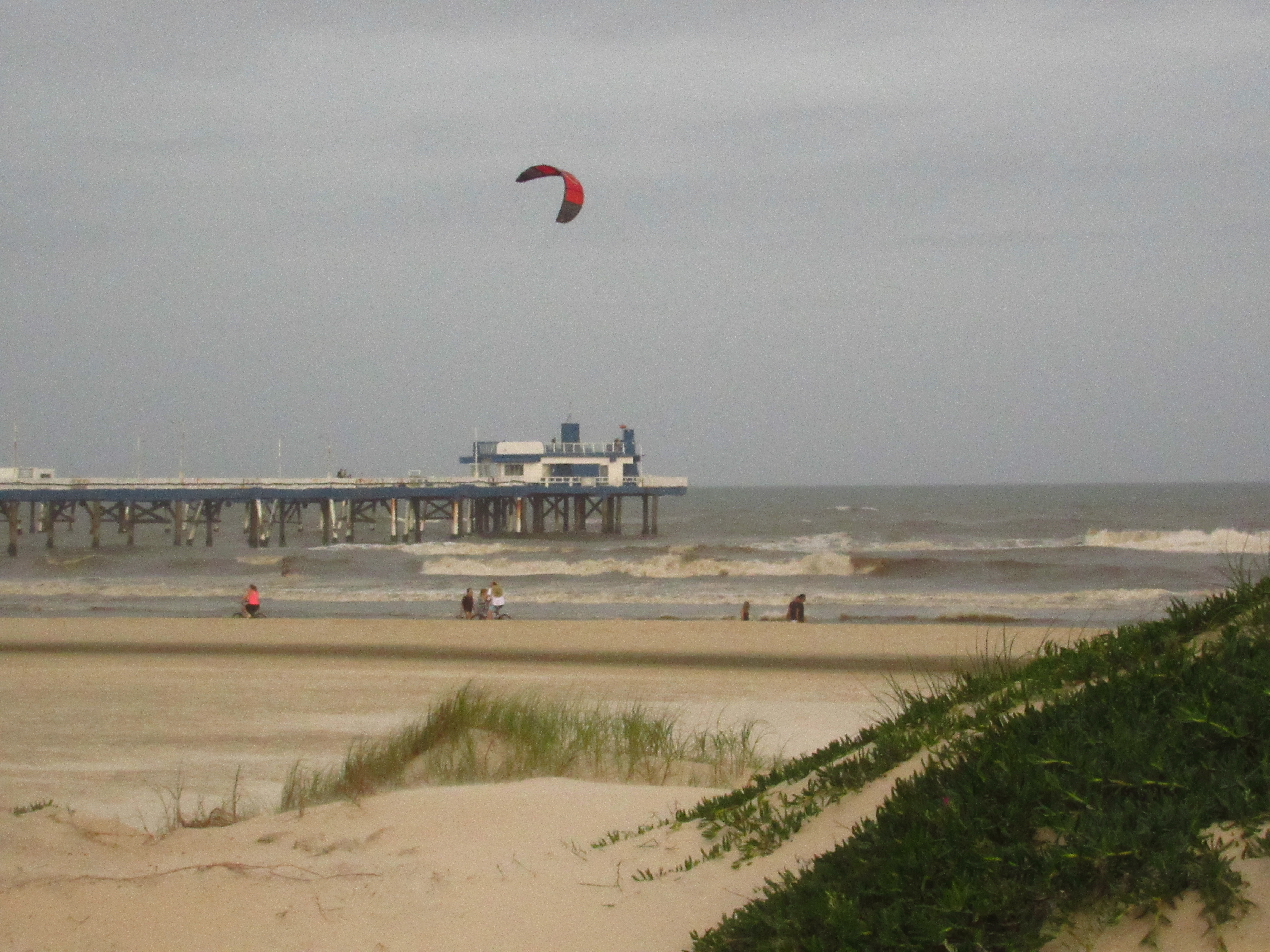 Pois já faz alguns anos que ela tem recebido pescadores que querem avançar no mar. Desde 1971 eles utilizam a estrutura inicialmente construída em foram de T, para fisgar os peixes do jantar. Mantida por uma associação de praticantes desta atividade, cobra um pequeno ingresso de quem quer apenas visitá-la e apreciar as ondas indo de encontro aos pilares. Ondas que com o passar dos anos acabaram por derrubar um de seus braços em 1994, mudando o seu formato para a letra L. Mas não só de peixes vive o local. A influência da construção no fundo arenoso, acaba por propiciar ondas de melhor formação atraindo surfistas que tentam domá-las, muitas desviando de linhas provenientes das varas que estão lá em cima. Em um conflito nem sempre pacífico entre estes usuários. Mas é em dias de muito vento, que tem aparecido ali e também em vários outros pontos do litoral, um número expressivo de praticantes de Kitesurf. O esporte onde se corta a água em cima de uma prancha sendo impulsionado pela força dos ventos, tem ganhado mais adeptos nos últimos anos, se tornando mais uma entre as várias atividades do verão. Este verdadeiro símbolo desta praia que se destaca na paisagem, está rumando ao cinquentenário sendo constantemente reforçado, para vencer a força do mar. Enquanto testemunha o ir e vir dos que buscam as mais variadas formas de lazer no seu entorno… É claro que voltaremos lá (sempre voltamos) para mais imagens… De outros ângulos.
