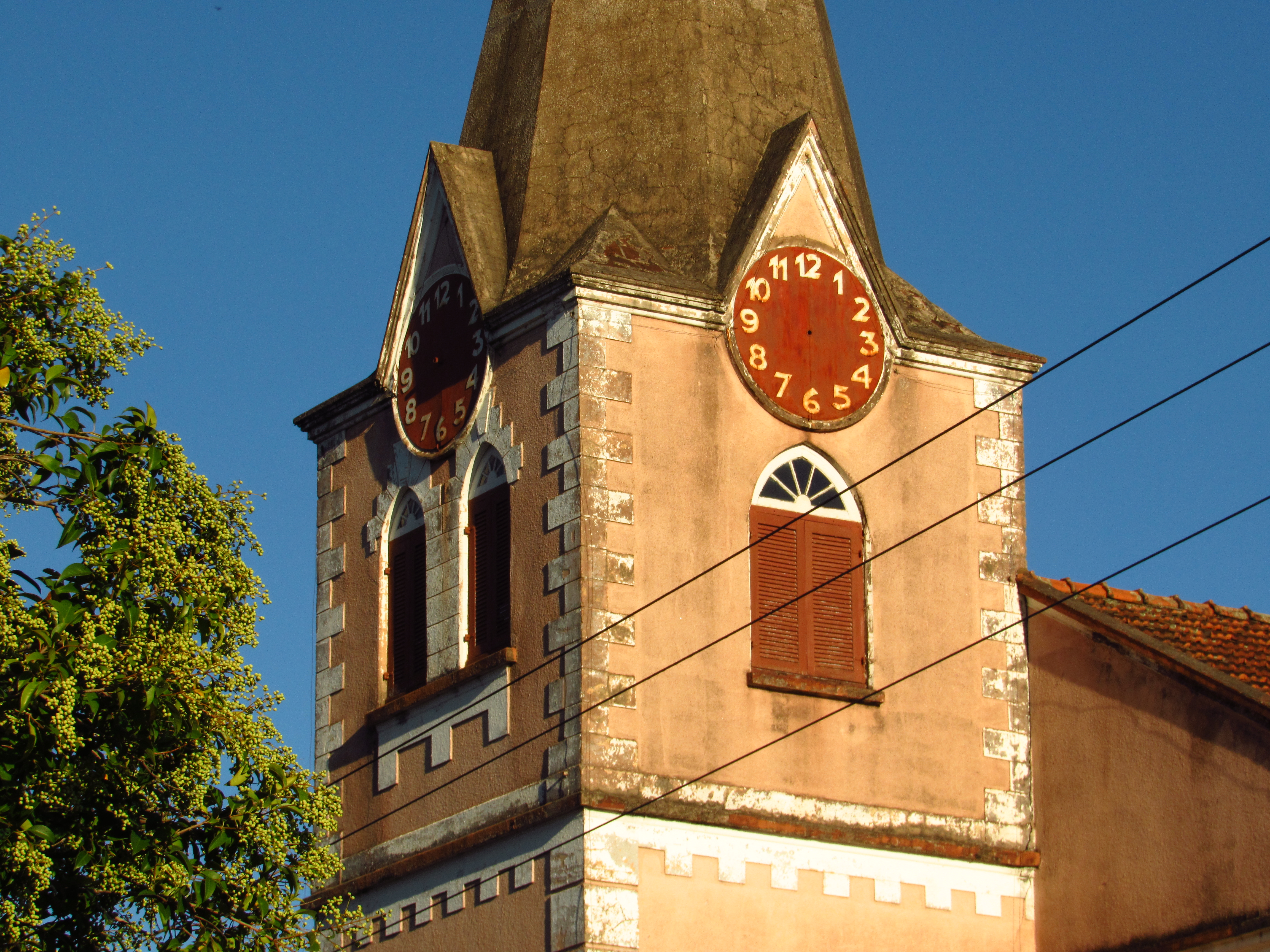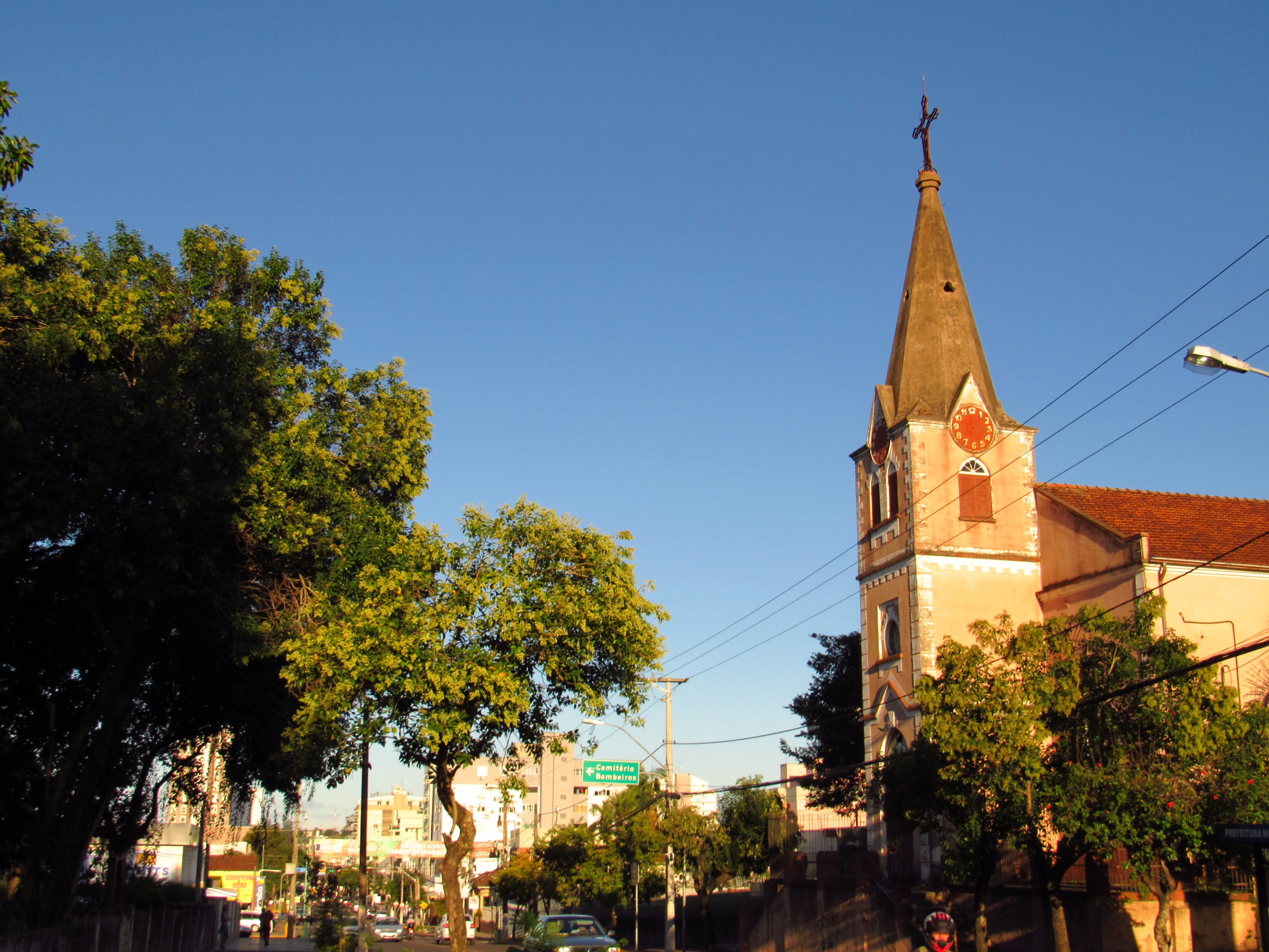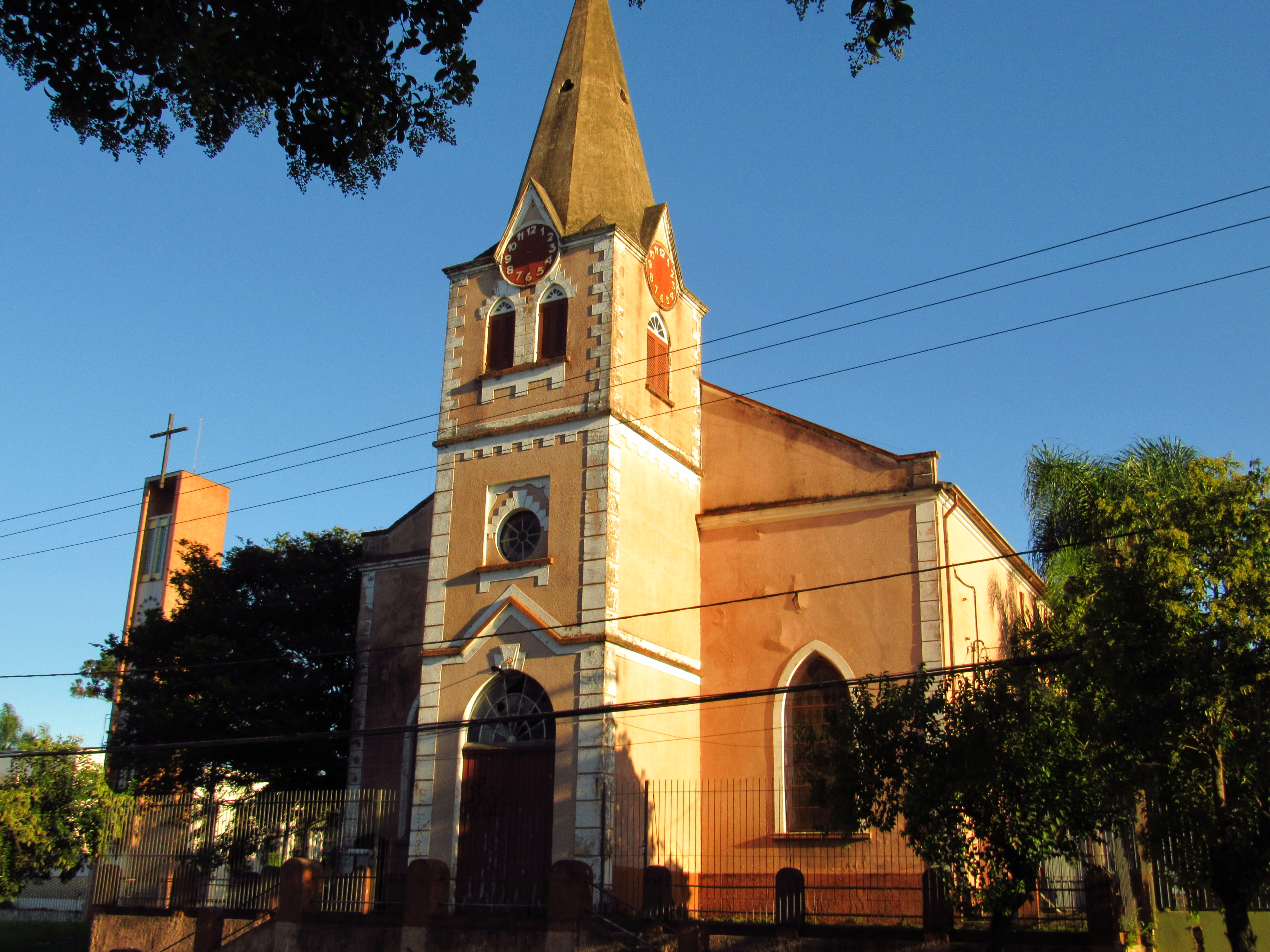 Pois foi a primeira do Rio Grande do Sul. Mas começou modesta, de madeira em 1828. A construção em alvenaria só se daria em 1851, para substituí-la e agregar os fiéis nos cultos desta religião. Com um relógio em cada uma das faces de sua torre única, seu tom rosado e seu estilo eclético funcionou até 1976 quando uma nova ao lado foi construída. Mas desta vez a antiga construção permaneceu como testemunho de décadas de encontro comunitário e exercício da fé. Como seguidamente comentamos por aqui, os luteranos estão fortemente vinculados à região de colonização germânica e sempre nos presentearam com estas construções. Algumas delas localizadas nas belas paisagens rurais dos vales gaúchos. Esta, no entanto, testemunhou o crescimento desta agitada cidade ao lado de Novo Hamburgo, e de sua avenida principal. Apesar de aparentemente sem uso e de portas fechadas, suas linhas seguem encantando os que passam no ritmo apressado dos dias. Enquanto aguardam que sejam concretizados novos planos para sua nova utilização. Pois beleza é que não lhe falta, ainda mais quando as cores do fim de tarde vão lhe emprestando luminosos tons.