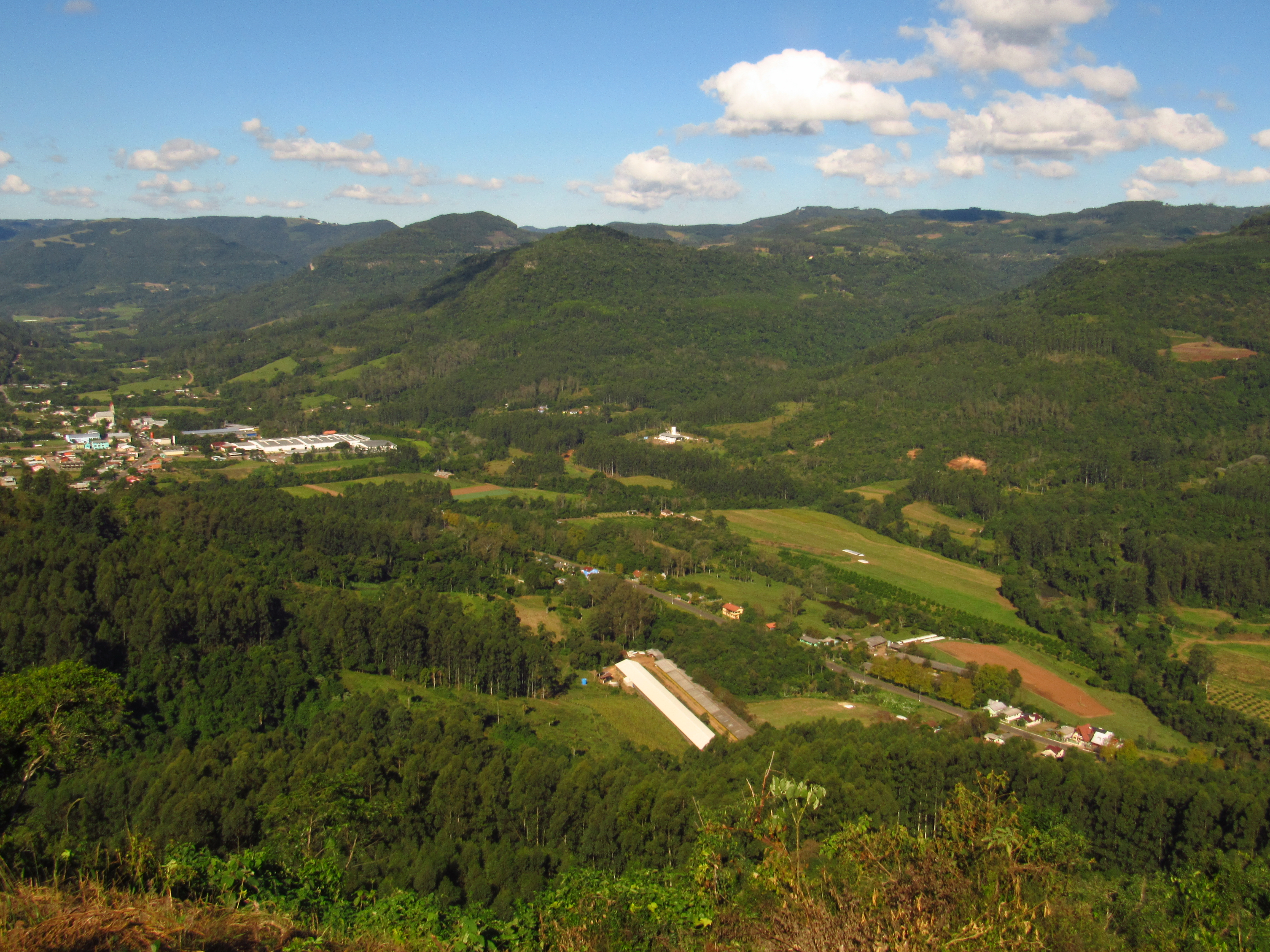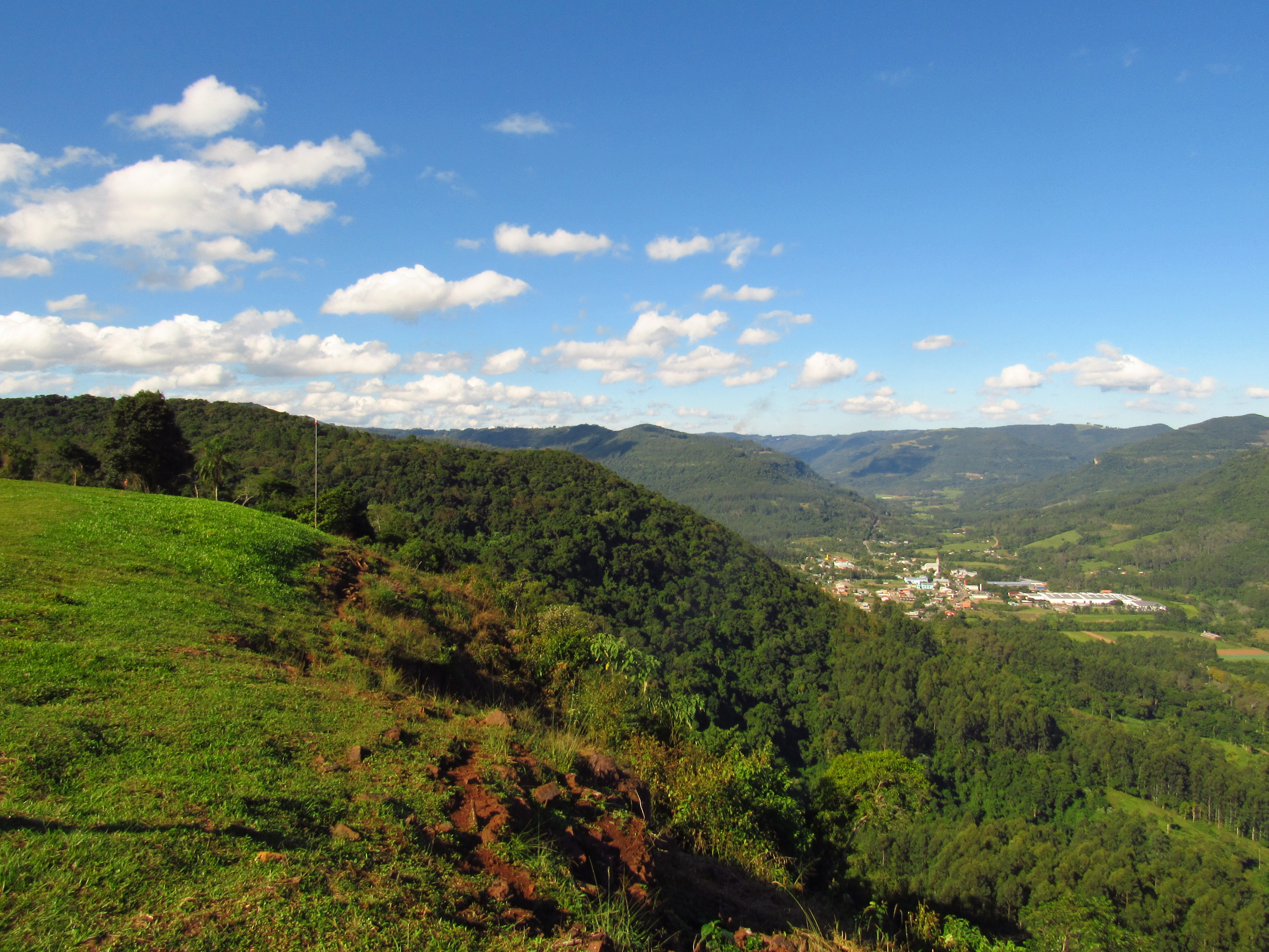 Mais um lugar com uma vista esplendorosa da serra gaúcha. A Picada Café é um dos pequenos municípios que enfeitam e encantam a Rota Romântica, roteiro onde está incluída as famosas Gramado e Canela. Banhada pelo Rio Cadeia, esta cidade possui um dos novos lugares para a prática de variadas modalidades de vôo livre, do nosso sul. O Morro do Vento com uma altitude de 375 metros vem atraindo os adeptos e apreciadores deste esporte que se jogam nos ares. Mas o lugar também recebe os que apenas querem observar a ampla vista do Vale do Cadeia onde se destaca a localidade de Joaneta, com sua igreja católica em homenagem a Joana Francisca do Chantal. Para subir até lá, nem é preciso andar muito, pois são apenas 2,5 Km de jornada em estrada de chão a partir da zona urbana. Um lugar com vista privilegiada onde, apesar de não ser possível admirar muitas cidades, como outros pontos que já mostramos (e ainda mostraremos) aqui, brinda seus visitantes com a paz e a harmonia que só a nossa exuberante natureza pode dar.