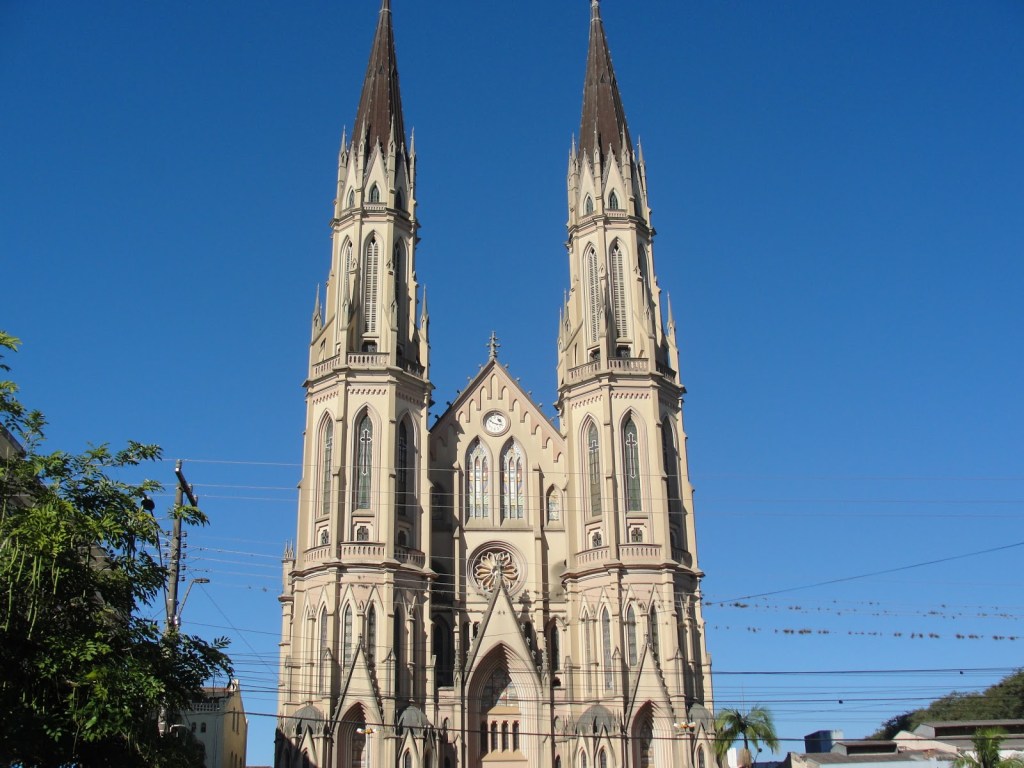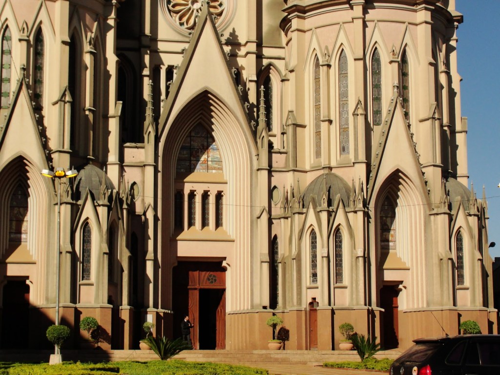 Que está na Catedral em homenagem a este santo de junho, localizada em Santa Cruz do Sul. Ela é uma das maiores neste estilo das Américas, e com suas duas torres de mais de 80 metros de altura se impõe na paisagem urbana. A riqueza de detalhes, do chão ao topo, impressiona a todos que tem oportunidade de apreciá-la. Seja bem de perto, ou de longe usufruindo da ampla praça em frente. Seu interior não é menos rico, com magníficos vitrais que remetem a cenas religiosas e as missões do noroeste gaúcho. Sua construção substituiu a antiga sede da igreja católica que ficava em frente, demolida após a conclusão da nova, por volta de 1940. As altas torres, no entanto, foram finalizadas somente na década de 70, e são vistas de vários pontos desta pujante cidade de origem germânica no Vale do Rio Pardo. No estilo gótico há ainda, uma igreja bem semelhante a esta na vizinha cidade de Venâncio Aires e em Novo Hamburgo. Ao menos no que consta a este que escreve…