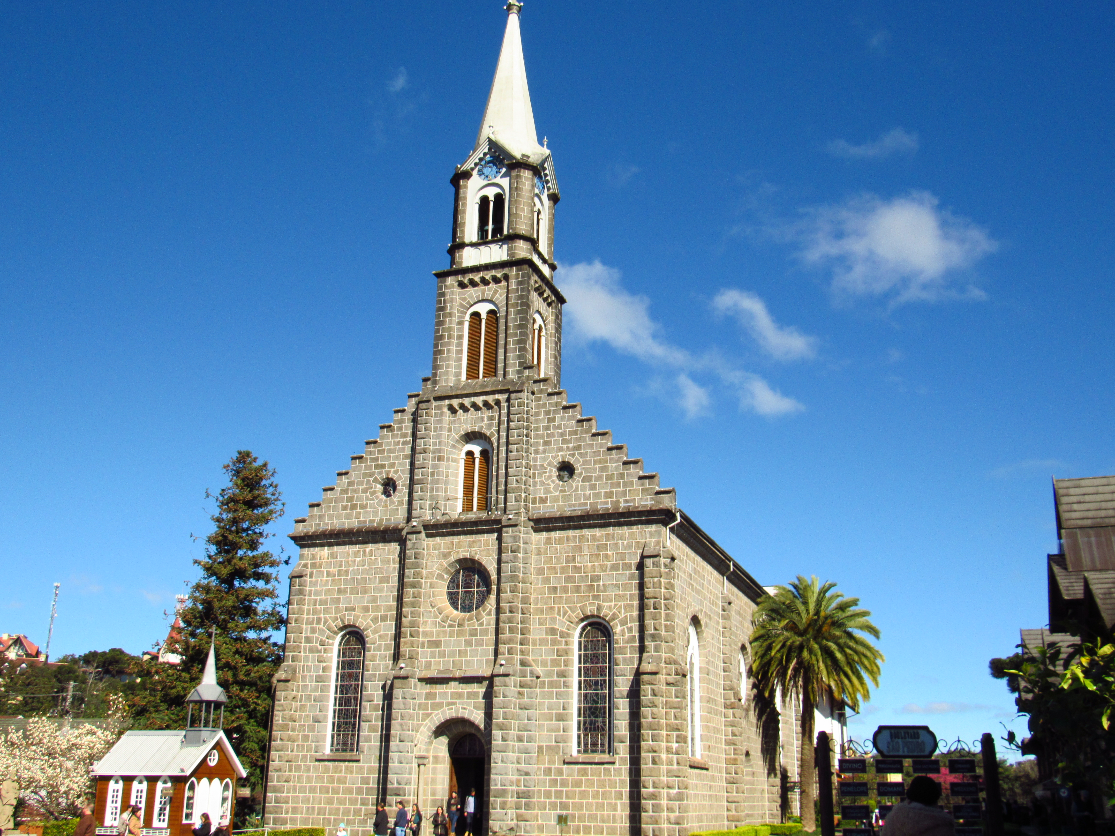 Que fica em Gramado na Serra Gaúcha. Construída com pedras basalto em 1942, ela centraliza o burburinho deste agitado centro turístico. Vizinha do Palácio dos Festivais de Cinema, da Rua Coberta, dos restaurantes e das lojas (principalmente as de chocolate), das estátuas dos apóstolos e da Fonte do Amor Eterno, ela se destaca na paisagem. Com um belo cenário serrano de pano de fundo, incluindo uma outra igreja com suas cores características, erguida pelos luteranos na subida de uma colina… Mas em meio a todo este cenário multifacetado, não se pode deixar de apreciar a sua bela essência. Suas paredes de pedra entremeadas com belíssimos vitrais atraem não só os fiéis, como também milhares de turistas com ou sem suas sacolas de compras. Mas com celulares prontos para uma selfie. Como todo o templo religioso, o respeitoso silêncio em horas em que não há celebração, se impõe. O que acaba contaminado o espírito, mesmo dos mais ávidos por cumprir intensos roteiros turísticos. Afinal, o conjunto da obra é de uma beleza singular…