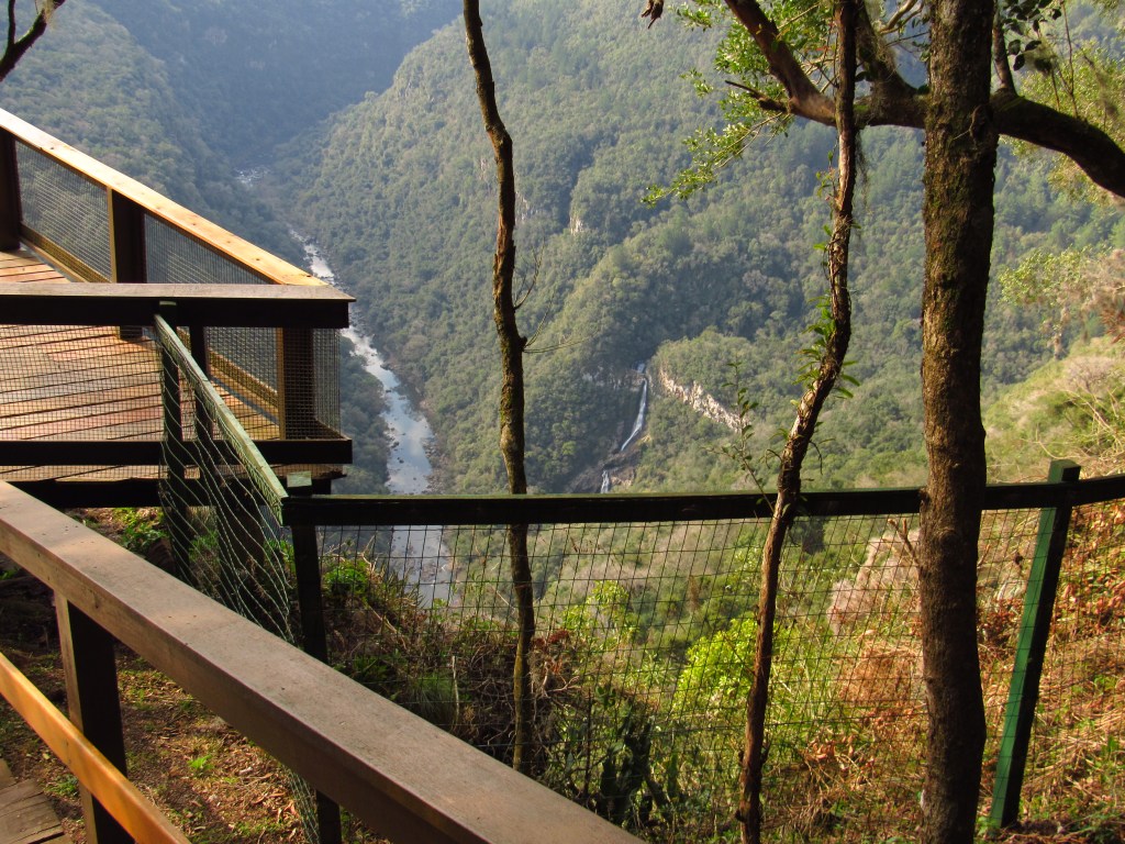 A impressionante paisagem deste vale que fica em um parque de Canela na Serra Gaúcha, não á única atração deste lugar. Apesar de que o simples observar das vistas dos diferentes mirantes bem estruturados, muitas vezes preencherem o espírito mesmo dos mais adeptos dos confortos das grandes cidades. Pois o que se enxerga lá do alto, é possível ser atingido pelos mais dispostos. Existem trilhas sinalizadas que permitem que se desça até as águas do Rio Caí que corre mansamente por entre grossas pedras. A mais longa dá direito ainda a apreciar de perto a Cascata do Arroio Caçador, que literalmente fura a pedra durante sua queda. Mas é preciso além de ter fôlego principalmente para a volta, os horários indicados, para não retornar depois do horário de fechamento do parque… Aos que não conseguem ou não querem enfrentar este desafio, basta seguir as indicações para desfrutar de caminhadas mais curtas e rápidas. Foi essa nossa escolha quando fizemos este último vídeo que colocamos no fim desta postagem e que fala também de outras atrações da cidade…