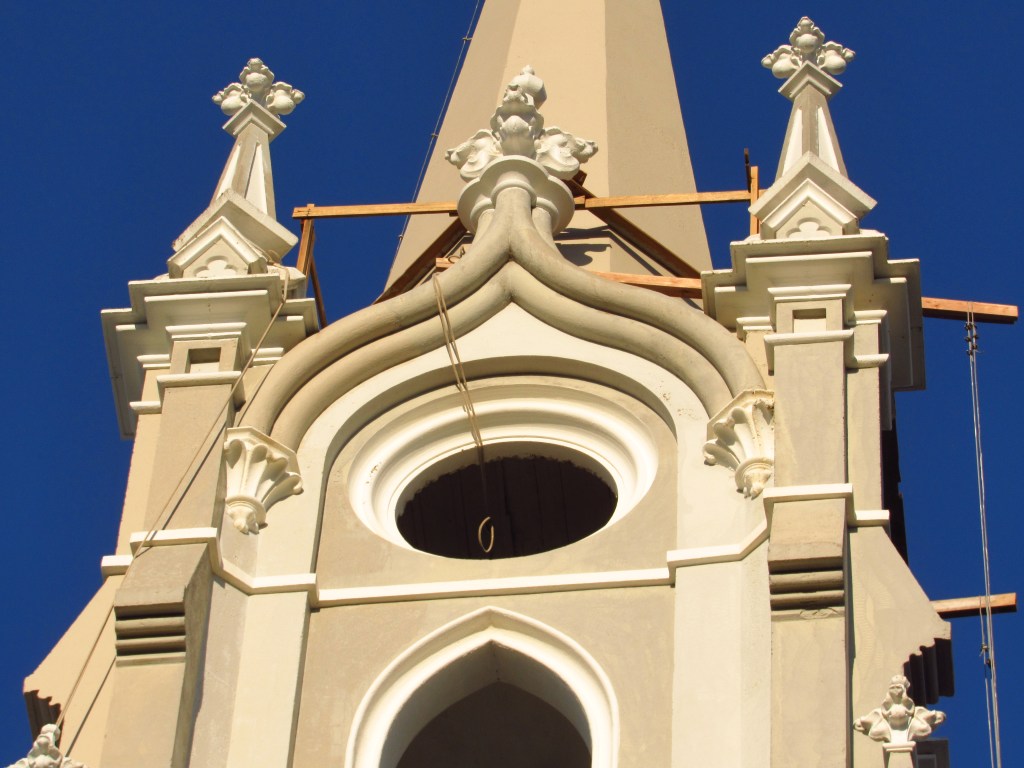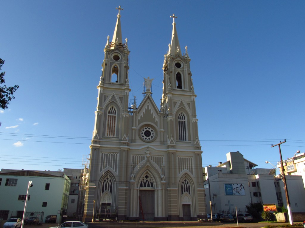 Porque parece que há um espaço para eles nas duas torres da bela e imponente Igreja de Santo Antônio nesta importante cidade da serra gaúcha. Em fase final de restauro em outubro de 2019 quando por lá passamos, nos chamou a atenção o espaço que parece perfeito para este encaixe e que estava vazio. Um pouco abaixo, em outra abertura, havia em uma das torres um conjunto de sinos, indicando que o outro conjunto deve estar em manutenção fora da construção… Mas e os marcadores do tempo? Foram retirados? Serão recolocados? Ou nunca chegaram a existir? Ao que parece também não foram queimados no parcial incêndio de 1998 quando as torres, segundo informações aqui da internet, não sofreram danos. Talvez nunca tenham sido colocados (há imagens antigas sem ele), porque simplesmente não foram. Não houve interesse ou mesmo recursos. Ou ainda serão postos para informar os já bastante informados fiéis, ou apenas enfeitar… A construção ficou pronta no final dos anos 40, após cinquenta anos de construção. Erguida em estilo gótico francês com projeto de um italiano possui além das duas torres “vazadas” belíssimos vitrais em seu interior, incluindo um com a cena da expulsão de Adão e Eva do paraíso. Não somente por isto, mas por toda a sua imponência é considerada uma das mais belas do Rio Grande do Sul, no que concordamos. Mesmo sem este elemento que faz parte de muitas construções deste tipo… Sabes alguma coisa a respeito deles? Tem uma história para contar? Então seria ótimo se compartilhasses conosco…