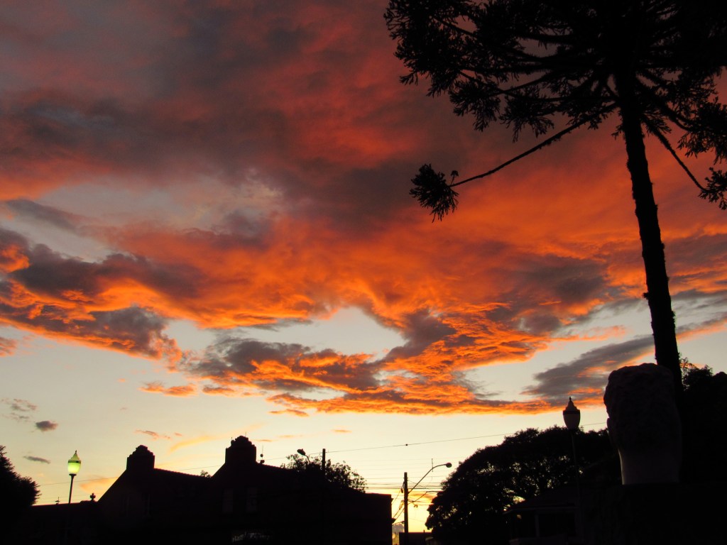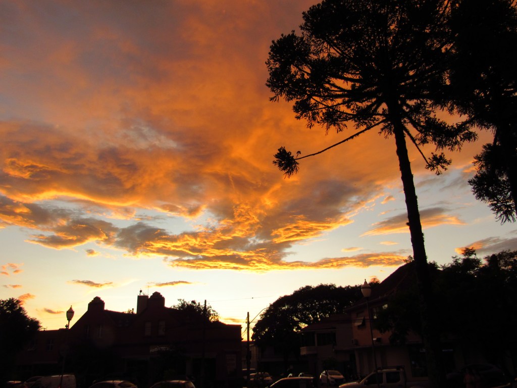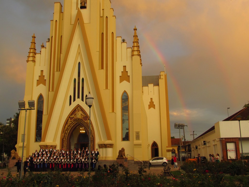 Os fenômenos naturais e sociais, estão aí em cada esquina a nos surpreender, e não é diferente quando percorremos os destinos do sul, para trazer um rico conteúdo pra ti. Ao longo dos caminhos que trilhamos em busca de belos lugares e histórias, somos por vezes surpreendidos por algo a mais. Foi o caso do incrível entardecer do último dia 6, junto à Igreja Cristo Rei e Bento Gonçalves. Com uma ponta de decepção ao perceber que as nuvens começaram a tapar o sol quando chegamos no lugar, iniciamos a captação de imagens. Mas com passar de alguns minutos, o sol voltou a aparecer para fazer brilhar a pintura recente do imponente prédio. E o céu também deu seu espetáculo, tingindo as nuvens em tons semelhantes aos escolhidos para a igreja, além de um espetacular arco-íris contra um fundo de nuvens cinzentas, a emoldurar a torre da nave… Foi um presente, que não sei se merecíamos, e agradecemos desde já. Mas com certeza foi um prêmio aos formandos de diversos cursos, que estavam ali se reunindo para participar de uma celebração religiosa alusiva à suas conquistas além de igualmente fazer imagens deste momento especial. Uma surpresa, que nos enche de alegria e incentivo para seguir no caminho…