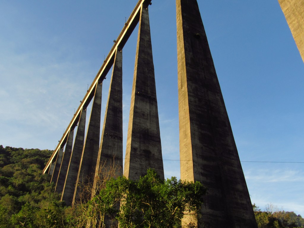 É a impressão que se tem quando se percorre uma estrada vicinal, ao lado desta ferrovia do Rio Grande do Sul e se observa os vários viadutos que entram dentro das elevações do terreno. A elaboração destas construções intercaladas com túneis, foi a solução encontrada para vencer a subida da serra ao longo o Vale do Rio Guaporé, afluente do Taquari. Identificados como todos, por números, o 11 e o 12 ficam em uma sequência que se pode apreciar ao longe, em companhia de outras belas paisagens do rio. Mas é logo após estes dois que está o famoso 13, o segundo mais alto do mundo. Sua imponência a quem o aprecia de baixo, impressiona e muitos sentem uma energia e uma força que somente grandiosas estruturas proporcionam. Os trilhos que ele suporta recebem trens de carga, mas recentemente foram realizadas as primeiras viagens de um iniciante trem turístico, que possibilita visão estonteante lá do alto antes de também entrar em um túnel. Concebida para ser um escoadouro da produção de grãos do noroeste gaúcho na década de 70, com o tempo a ferrovia passou a atrair os que apreciam as belas paisagens naturais do sul. Mas também diferentes e interessantes estruturas que acabam complementando o cenário, e possibilitando belas imagens… Um pouco mais dos viadutos e do belíssimo vale estão nas imagens e no vídeo que colocamos nesta postagem.