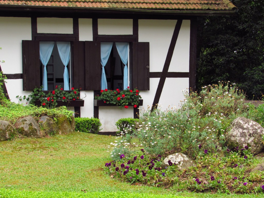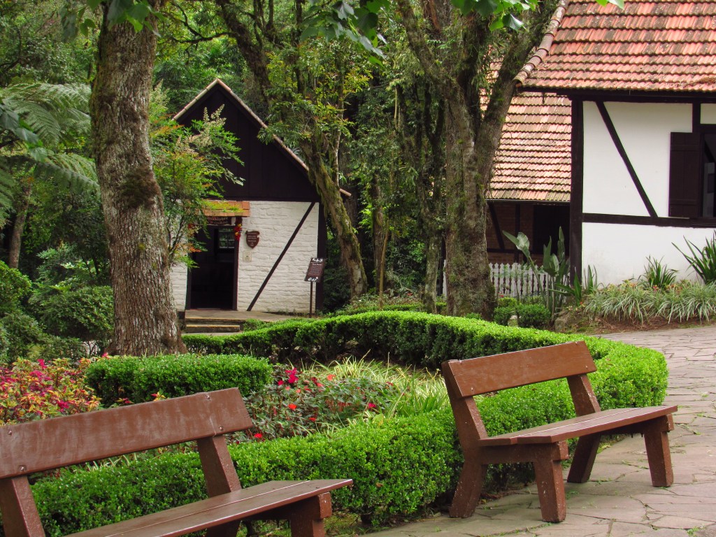 O Parque Aldeia do Imigrante em Nova Petrópolis é formado por um conjunto de prédios em estilo enxaimel que foram trazidos do seu lugar original e remontados neste lugar. A vila é centralizada por um Igreja Luterana que ao ser remontada foi acrescida de elementos da religião católica a tornando ecumênica. Seu interior é rico em detalhes que utilizam madeira, formando um belo conjunto arquitetônico. Ao seu lado as sepulturas com inscrições em alemão, compõe o cemitério, pois era comum sua localização ao lado dos templos religiosos. Como aliás ocorre ainda hoje me muitas comunidades rurais. Mas é a casa onde está instalado o Museu Municipal, que guarda uma interessante história. O lugar funcionava como um hospital idealizado pelo médico alemão Karl Wismann que foi um dos “voluntários da pátria” tendo atuado na Guerra do Paraguai. Na volta além da recompensa em dinheiro e um lote de terra, ainda ganhou o título de doutor em medicina, pelas mãos de Dom Pedro II. O ensino está presente também nesta comunidade, com a casa do professor, onde estão reproduzidas cama, mesa de estudos e de jantar, desta pessoa que gozava de grande prestígio entre os colonos. Na escola da comunidade, que fica ao lado, podem ser apreciadas também as carteiras dos estudantes, todas elas dotadas de lugares par as canetas tinteiro. E no quadro está reproduzida uma aula de português, onde os alunos que nasceram falando alemão, podiam aprender a língua oficial de sua nova pátria. Um lugar repleto de histórias que ainda tem muito mais a mostrar…