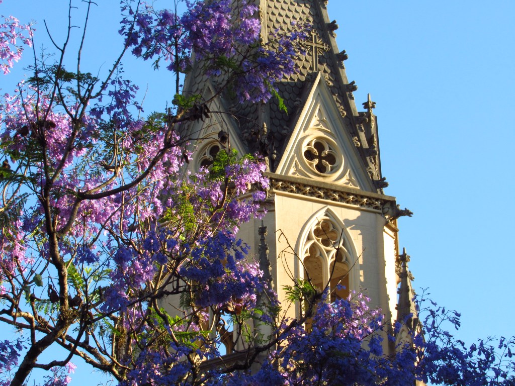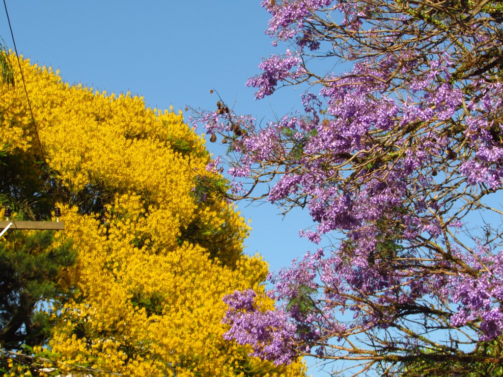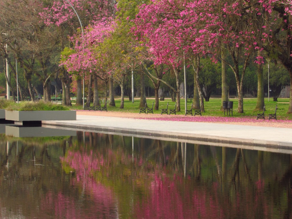 A primavera na capital gaúcha vai avançando e deixando um rastro de cores características de suas variadas espécies de árvores. A paleta de tons começa com o rosa dos Ipês Roxos que inundam a alameda principal do Parque Farroupilha também conhecido por Redenção, a partir já de agosto. E a saga continua com outros ipês, os de cor amarela, que se espalham por diferentes ruas e bairros da cidade, apesar de não nos parecerem tão intensos neste 2020. Mas há outra flor amarela que também dá o ar da graça em espécimes muitas vezes de grande porte, como é o caso do Guapuruvu, que assim como as anteriores é nativa aqui da região. Mas é no mês de outubro, que as ruas principalmente dos bairros Rio Branco e Bom Fim, são preenchidos pelo roxo (ou seria lilás) dos Jacarandás. Esta espécie trazida da Amazônia, também está bem presente no Centro Histórico de Porto Alegre, principalmente na Praça da Alfândega. É lá que ele faz sombra aos que frequentam a Feira do Livro, que ocorre ali na época de sua floração. Pra fechar o ano, como que anunciando o Natal, surge em dezembro o Flamboyant, nativa da ilha africana de Madagascar que completa as verdes folhas, com flores de uma intensa cor vermelha. Um espetáculo visual, que temos certeza, não consegue deixar indiferente quem circula pelas ruas e calçadas desta importante metrópole do sul…