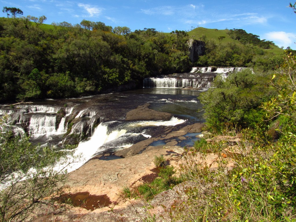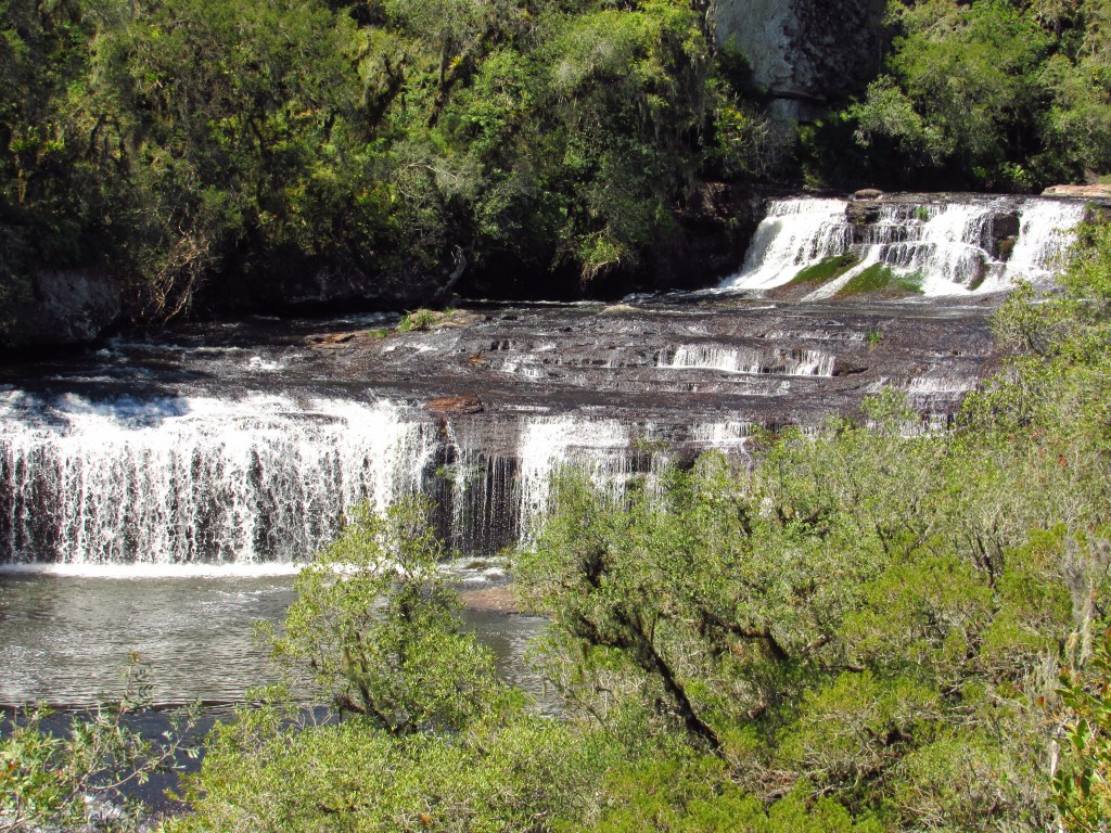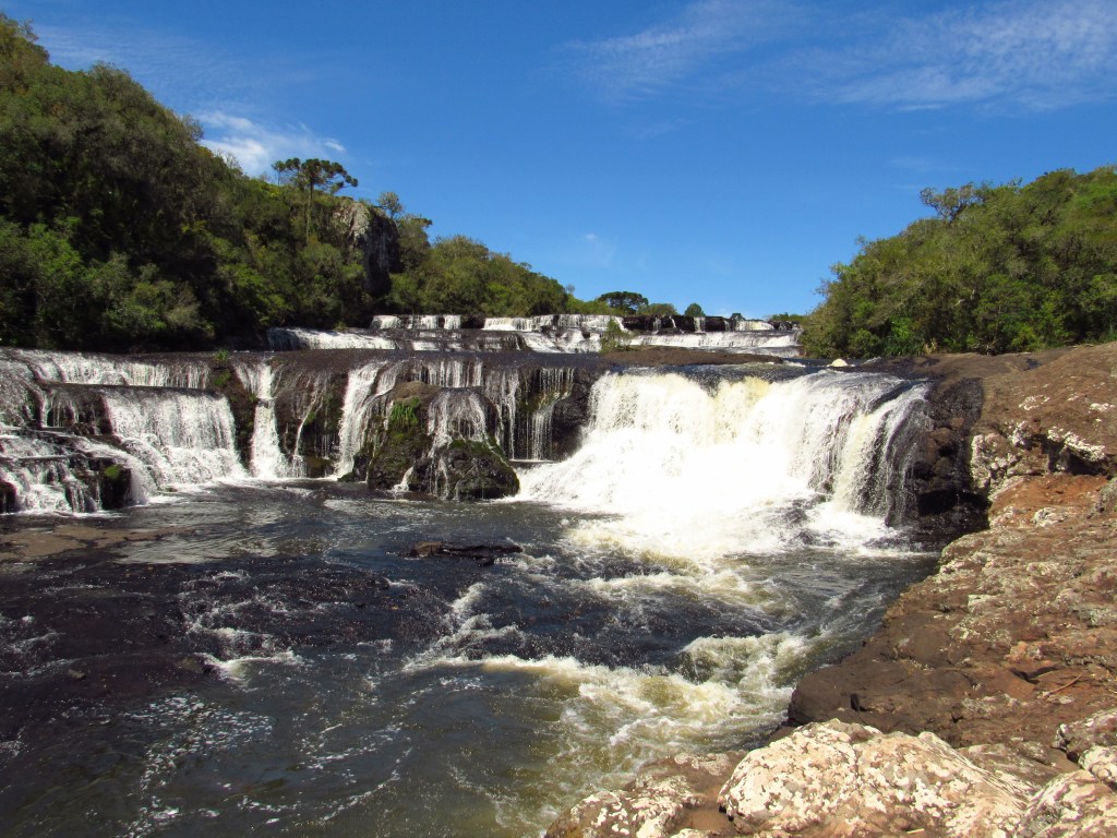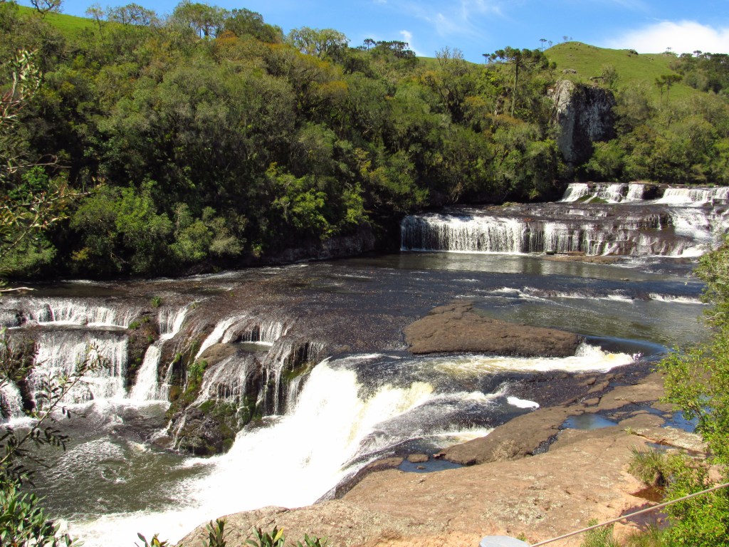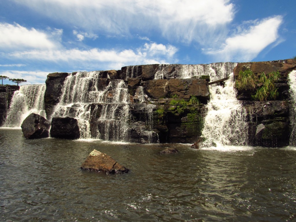 Esta é uma das mais belas cascatas em que nós já estivemos. Ela fica em Jaquirana, mas com maior proximidade da zona urbana de Cambará do Sul. São cerca de 23 Km, sendo 15 de estrada de chão até chegar neste pequeno paraíso. Se paga um ingresso e há estrutura no local, para que apreciar as vistas e até tomar banho próxima à primeira queda. Esta é bastante longitudinal sem, no entanto, ser muito alta. Após despencar ali, o Rio Camisas segue em um lento serpentear por sobre um leito de pedras, formando uma fina lâmina d´água que convida a uma reflexiva e lenta caminhada… Mas é um pouco mais adiante que se deslumbra o restante do espetáculo. Outras três quedas, que na realidade são três níveis do rio, formado por um conjunto sem fim de pequenas cascatas, seguindo na formatação larga do curso d’água. Há pontos interessantes para poder o visual de alguns ângulos diferentes, e perceber o que parece ser uma mini Foz do Iguaçu, dada a diversidade dos caminhos percorridos pelas águas cristalinas. Mais um pedaço incrível dos fantásticos Campos de Cima da Serra.