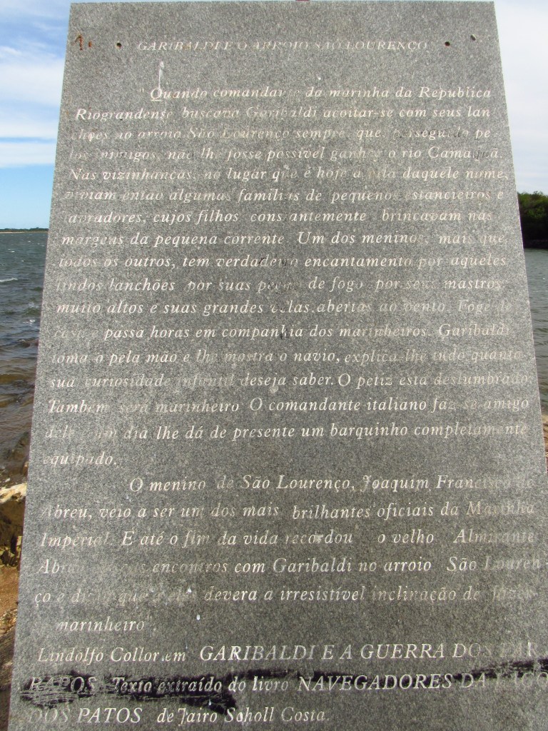 Fica na cidade de São Lourenço do Sul o lugar onde o rio São Lourenço encontra as águas da imensa Lagoa dos Patos, que não por acaso é conhecida como mar de dentro… Afinal, a outra margem a partir desta foz fica a mais de 50 quilômetros de distância… Utilizado por barcos particulares de passeio, da comunidade de pescadores e que transportam turistas pela lagoa, o rio também é um convite a um passeio sem pressa por suas margens. As frondosas árvores com destaque para os Plátanos, que enfeitam o caminho ao lado das águas, compõem um cenário que inspira a calma e a tranquilidade. Mas nem sempre foi assim. Pois por estas águas passaram embarcações que avançavam lagoa adentro, com destino aos combates e guerras de séculos passados. Como aconteceu com a frota comandada por Giuseppe Garibaldi durante a Revolução Farroupilha entre 1835 e 1845. E ele inspirou alguns meninos que gostavam de brincar nas praias e apreciar os grandes mastros, os canhões e as velas ao vento… Um deles inclusive teria sido presenteado por Garibaldi com um passeio em um de seus navios, selando o seu sonho de futuro. O menino era José Francisco de Abreu, neto de Donana da Fazenda do Sobrado, que seguiria carreira na marinha brasileira vindo a ser conhecido por suas façanhas na Guerra do Paraguai. Neste conflito o já denominado Almirante Abreu, teria inclusive comandado o conserto de um barco avariado durante uma sangrenta batalha, além de ter dado nome ao um navio da frota nacional no final de século XIX… E ele também dá nome a uma rua na capital gaúcha e outra no centro desta bela cidade do sul do Rio Grande do Sul, que possui ainda um conjunto de charmosas praias muito procuradas nos meses de verão. Os veranistas da cidade e de outros lugares, além de aproveitar o sol, ou mesmo a sombra de mais árvores que completam a paisagem das areias brancas, podem desfrutar das águas da Lagoa dos Patos. Para simplesmente se refrescar, ou mesmo imagina antigas embarcações que circulavam por ali, e inspiravam os sonhos infantis de outros tempos…