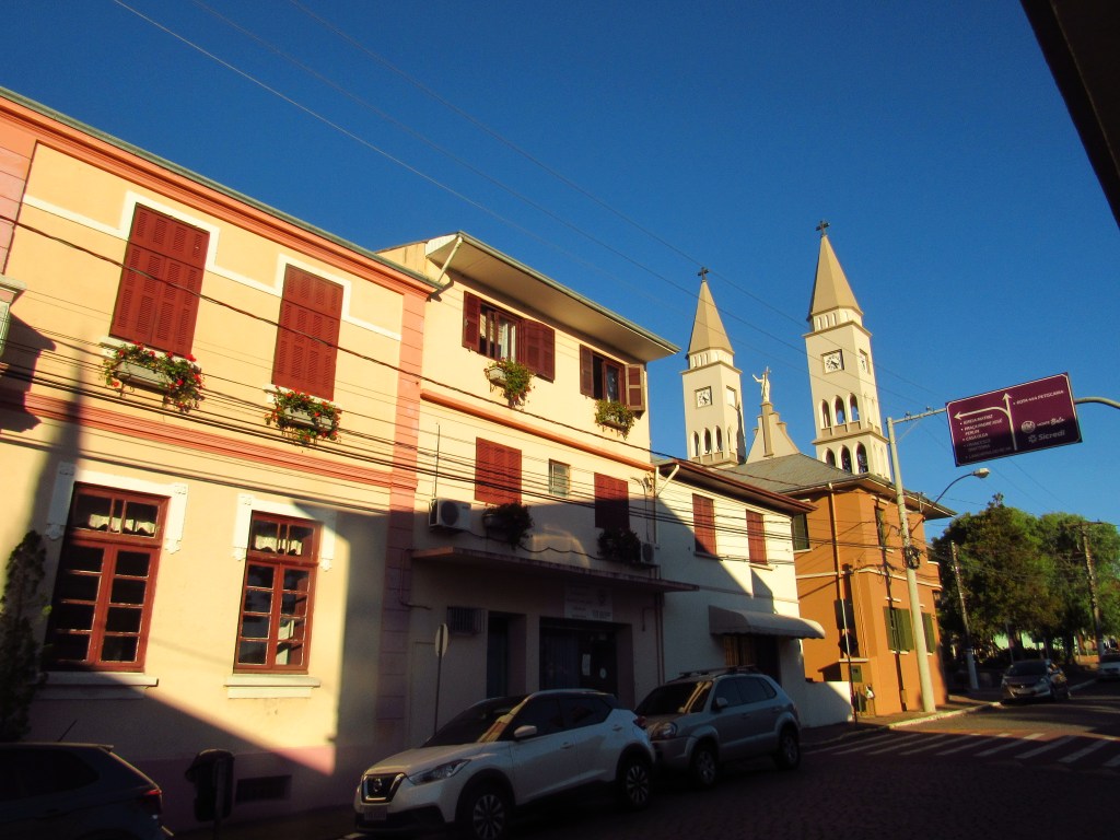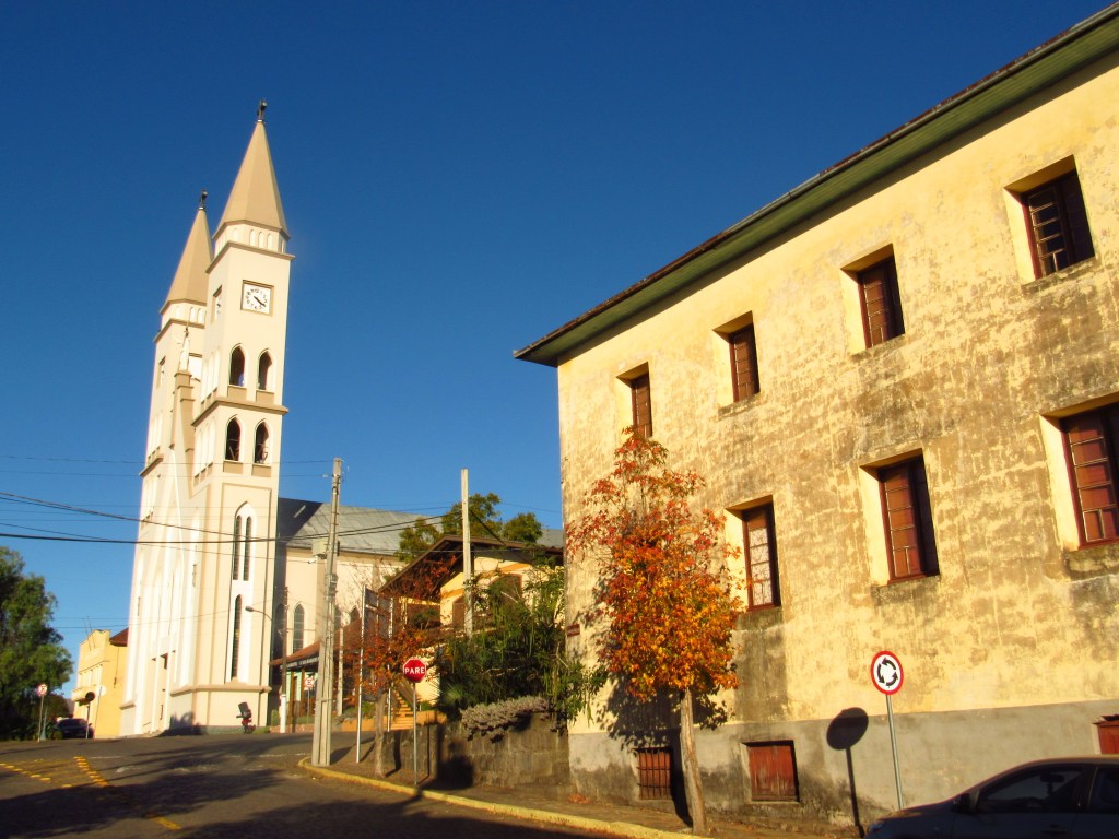 Em meio ao Vale dos Vinhedos, fazendo divisa com Bento Gonçalves, esta preciosidade da imigração italiana é um convite a viver momentos agradáveis em meio a belos cenários. Principalmente no outono, quando o tom das árvores que enfeitam a zona urbana de Monte Belo do Sul, e se espalham em meio aos parreirais, adquirem tons alaranjados e avermelhados… A então localidade fundada por imigrantes italianos que chegaram ali em 1877, teve seu nome inicial, Linha Zamith de origem maltesa, escolhido por padres capuchinhos de origem francesa, primeiros administradores da paróquia. O nome Montebello, desta forma como na língua italiana, foi utilizado a partir de 1898, sendo substituído por Catumarã, de origem indígena que significa povoado bonito, entre 1945 e 1949. Troca esta muito provavelmente pelo fim da segunda guerra mundial onde italianos e alemães eram inimigos… Mas o nome “voltou” a ser Monte Belo (deste vez em português), para, na emancipação em 1992, ganhar seu nome atual acrescentado “do Sul”… A igreja que centraliza a cidade possui duas altas torres de 65 metros de altura cada e faz homenagem a São Francisco de Assis. Apesar de não ser das mais antigas, pois ficou pronta em 1965, possui um estilo mais clássico, com vitrais interessantes como acontece em outras com mais décadas de idade… Em seu entorno uma simpática praça e casarões centenários, parte deles ocupados por lojas e restaurantes, completam um interessante ambiente. E não muito longe deste núcleo central a apenas uma leva caminhada, se pode desfrutar de um mirante estruturado com uma impactante vista para o Vale dos Vinhedos. E esta paisagem fica especialmente interessante ao final de tarde quando o sol ilumina os prédios da zona urbana de Bento Gonçalves a cerca de 10 km de distância em linha reta (um pouco mais do que os 7 que falamos equivocadamente no vídeo…) Uma pequena comunidade com belos encantos e outras atrações que não estão neste vídeo, mas que são um verdadeiro convite a voltar outras vezes, para desfrutar de mais este lugar incrível da Serra Gaúcha…