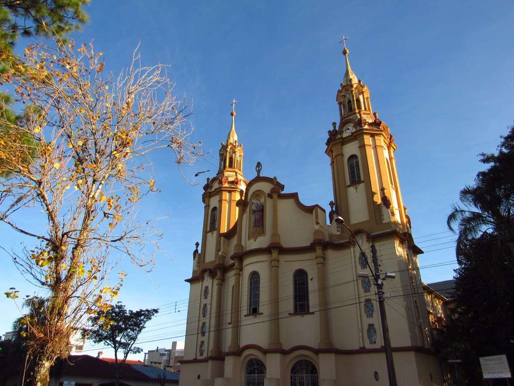 A cidade de Cachoeira do Sul tem muita história pra contar, e já comentamos algo sobre os primórdios da ocupação humana na região e seu desenvolvimento. E é claro que esta trajetória se transformou no estabelecimento de vários prédios marcantes, alguns já mostrados por aqui. Mas tem mais. O principal destaque é sem dúvida o conjunto da Praça Baltazar de Bem formado pelo Paço Municipal, a Igreja Nossa Senhora Imaculada Conceição e o Chateau D’Eau. O prédio do paço, que abriga o Museu Edyr Lima, homenageando o primeiro doador do seu acervo, foi erguido em 1864 para ser sede da Câmara Municipal, mas também foi um Hospital Militar durante a Guerra do Paraguai, cadeia e residência do juiz, antes de ficar fechado durante os primeiros anos do Século XXI. Seu restauro e reabertura em 2017, permitiu que fosse colocado ali, um acervo ampliado do museu que existia desde 1978. Em frente a ele já existia desde 1799 a Igreja que homenageia a imaculada, mas após recente restauro e pintura completa da imagem que fica no alto (um dos acréscimos de várias modificações ao longo dos anos), se descobriu que ela fazia referência a Nossa Senhora das Graças… E nas modernizações de uma cidade que crescia foi acrescentado entre estes dois prédios em 1925, as estruturas de um reservatório de água, que é uma verdadeira obra de arte. Com estátuas de Ninfas e o deus Netuno da Mitologia Grega, a construção que recebe o nome francês que significa Castelo das Águas, foi também recentemente tombada e restaurada. Mas não faz mais parte do sistema de distribuição de águas da cidade desde 1970, servindo hoje apenas como local de passeio… Não muito longe deste marco da cidade fica outra imponente igreja católica dedicada a Santo Antônio erguida em 1937 por Padres Redentoristas, em frente a uma bela praça e a poucos metros de outro ícone da cidade, o prédio do antigo Colégio Imaculada Conceição de 1921. Assim como a igreja ele está perfeitamente preservado e hoje abriga outra instituição de ensino não mais vinculada ao catolicismo. Bem preservado também está o prédio que marcou a cidade por ter sido sede da União de Moços Católicos a partir de 1924, instituição destinada a formar lideranças que seguissem os preceitos religiosos. Com suas belas estátuas, provavelmente colocadas um pouco antes, quando ali existia o Clube Renascença fundado em 1917, o prédio foi um importante polo cultural da cidade. Afinal, ali funcionou um conservatório de música, clubes de literatura e outros movimentos deste tipo. Antes disso, porém, a edificação construída por volta de 1850 serviu de residência para três gerações da família Coelho Leal de origem portuguesa, antes de ser transformado no clube. Hoje é a bela e bem pintada fachada de um condomínio residencial erguido nos anos 1980, após passar por um período sob a administração da Diocese de Santa Maria. Uma prova que independente dos usos e dos proprietários, um importante patrimônio pode ser preservado, formando com outros equivalentes, um interessante conjunto que só embeleza uma cidade. Os extasiados visitantes agradecem…