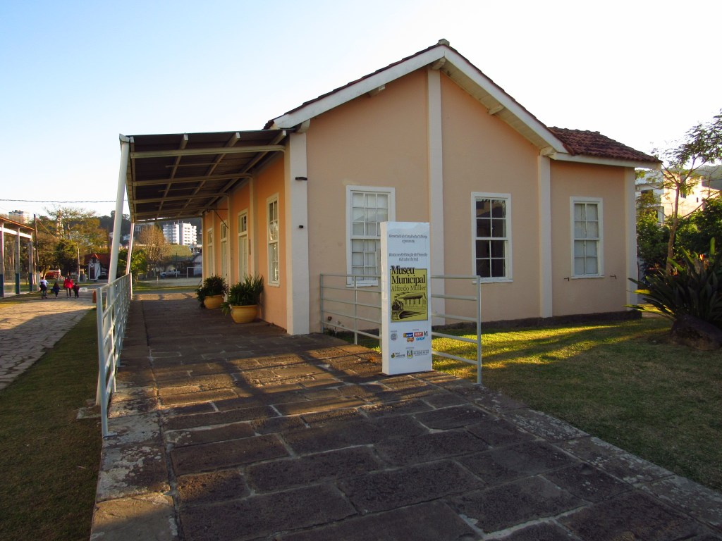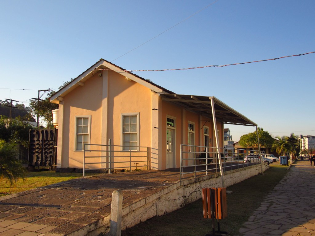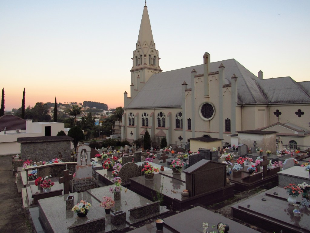 Na encosta da Serra Gaúcha nas proximidades da região de imigração italiana, duas pequenas cidades de origem germânica além de estarem bem próximas uma da outra, nos surpreenderam com duas preciosidades. Mesmo sendo tipos de lugares que costumamos mostrar com frequência por aqui. Afinal de contas, quem nos acompanha sabe que antigas estações de trem, com suas lembranças de chegadas e partidas; e marcantes igrejas de outros tempos que ainda centralizam comunidades, sempre nos encantam. Pois em tarde fria de sol demos atenção a antiga Estação de Trem de Salvador do Sul, que em 1909 quando foi erguida chamava-se São Salvador. Mas ela não é somente um antigo prédio bem preservado. Dentro funciona o Museu Municipal, com uma estrutura moderna elaborada por profissionais capacitados, e que conta trajetórias que vão além das ferrovias… As histórias que vinham pelos trilhos obviamente estão em destaque e são completadas por outras contadas em didáticos painéis como o dos Mustereiter, ou Cavaleiro do Mostruário em alemão. Estes pioneiros nada mais eram do que caixeiros viajantes que traziam mercadorias em lombos de mula, enfrentando o acidentado terreno da região… Entre os testemunhos de outras épocas, um grande Wandschonner que é um pano de prato com frase escrita em alemão que enfeitavam antigas casas, ganha destaque acrescido de uma placa com a devida tradução. Relatos da religiosidade, lazer e educação de gerações que já passaram, fazem companhia a lousas usadas por antigos alunos, um livro de geografia dos anos 1930 e muito mais… Mas ainda havia tempo para seguir adiante neste dia (que já tinha rendido outros conteúdos)… A poucos quilômetros de distância dali, como se fosse um outro bairro de uma cidade grande, fica São Pedro da Serra e sua imponente Igreja Católica em homenagem a este santo. Infelizmente neste dia suas portas estavam fechadas aos fiéis e visitantes inesperados, e os vitrais de seu interior só puderam ser admirados por fora. Mesmo assim, seus belos traços externos puderam ser fotografados e filmados mesmo que o sol já começasse a se esconder, o que não tirou o seu brilho… Inaugurada em 1933 após um mutirão iniciado seis anos antes, ela foi entregue não totalmente completa. E um bolão com sorteio de prêmios teria sido realizado, com o objetivo de arrecadar fundos para seu término que só se deu de fato em 1937… Como acontece com frequência na região, o cemitério fica ao lado do templo, integrando por muitas vezes as cerimônias de sepultamento de vidas. Que descansam na eternidade em lugar com bela vista para as montanhas. E ali estão muitos daqueles que ajudaram a desbravar estas encostas íngremes, deixando descendentes que seguem valorizando a sua comunidade. Pois também foi possível perceber que novas estruturas de lazer como praças e centro de convivências, vem sendo colocadas no seu entorno. Para integrar a comunidade, e bem receber os visitantes que ainda sobem e descem a serra. Como já faziam os viajantes de outros tempos, seja no lombo de mulas, ou nos trilhos dos trens…