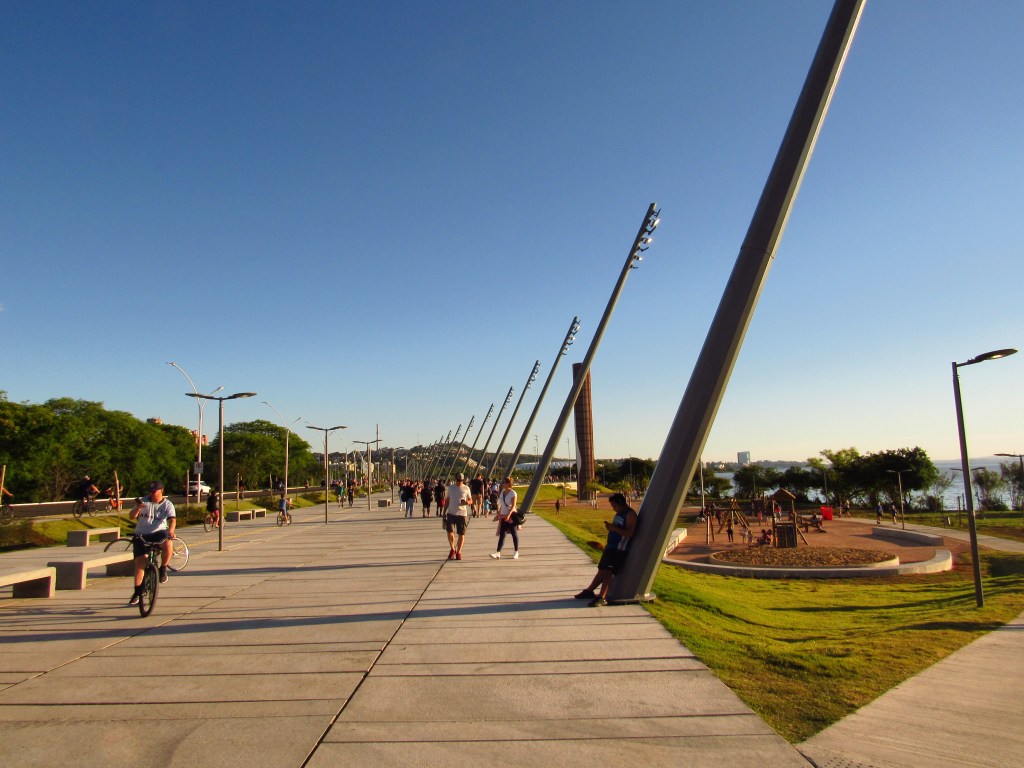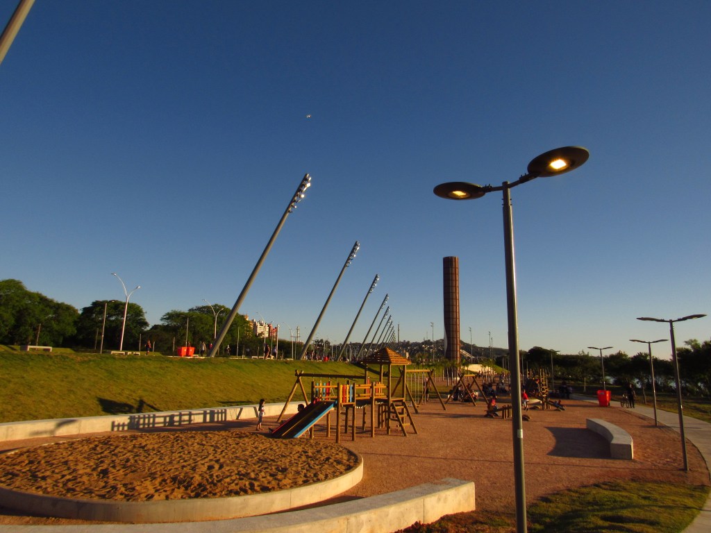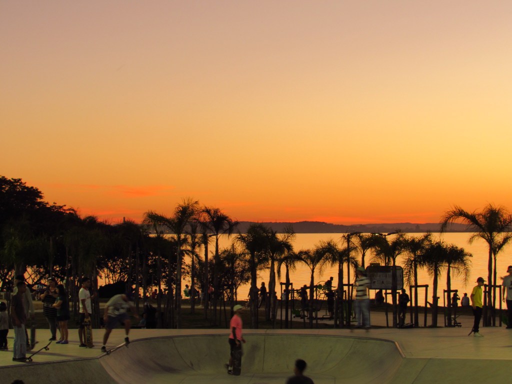 Pois foi com o desejo, os esforços e porque não divergências de toda uma comunidade que talvez extrapole as fronteiras da cidade, que este sonho foi realizado. O sonho de se reaproximar do Lago (ou rio?) Guaíba, que vem ocorrendo nos últimos anos. A capital de todos os gaúchos e gaúchas tem recebido diversos investimentos que buscam atrair mais e mais visitantes para a beira da água. Há 3 anos a fase 1 da Nova Orla mais próxima do Centro Histórico (que já mostramos aqui) foi entregue e agora a fase 3 mais dedicada ao esporte já recebe gentes de todos os cantos… E ainda há um início de reutilização do Cais do Porto (que ainda não mostramos) com áreas de lazer gastronomia, além da expectativa da fase 2 e a recuperação do simbólico prédio da Usina do Gasômetro, para completar um espaço que com certeza marcará gerações. Estruturada com canchas de diversas modalidades esportivas, incluindo até mesmo o uso de grama sintética para o tradicional futebol, esta etapa entregue neste mês de outubro, convida principalmente ao exercício físico. E o grande destaque que centraliza estas estruturas, é a maior pista de skate da América Latina, com diversas características de obstáculos que contemplam desde os principiantes, até mesmo os mais experientes e profissionais, desta modalidade que agora é olímpica. Um verdadeiro novo ícone que certamente atrairá olhares curiosos mesmo daqueles que não praticam esportes, mas que apreciam a beleza plástica de ousadas manobras… Ao lado de caminhos pavimentados e áreas verdes mantidas, as águas do Guaíba seguem ali como sempre estiveram, ao alcance de todos. Mas agora com uma estrutura urbana, que inclui ainda bares e iluminação noturna, que convidam os que gostam também destes modernos confortos, para desfrutar de agradáveis momentos ao ar livre. E apreciar (como fizemos neste dia de primavera) o que por muitos é considerado o por-do-sol mais belo do mundo… Um símbolo da nossa cidade, e algo admirado e cultuado pelos que refletem sobre o fim de um dia, e a esperança renovada do retorno da luz no dia seguinte…
