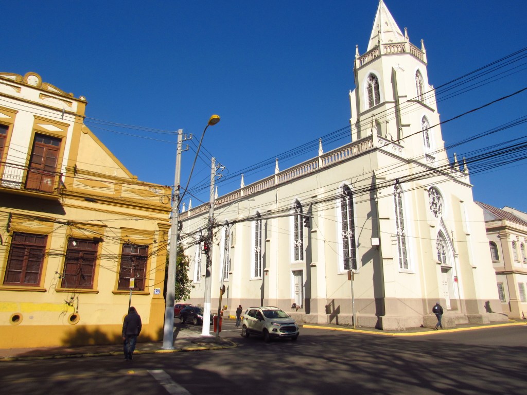 Muitos talvez conheçam e passem apressados ao longo do dia, pelo ambiente perto da ponte onde está o monumento que celebra o centenário da imigração em 1924. Afinal, a praça do Imigrante é um ponto central da cidade, e como muitas vezes acontece tem a companhia de uma igreja católica… A igreja Nossa Senhora da Conceição se impõe ao lado de outros prédios históricos, como a primeira sede de uma importante universidade da região, e outros mais recentes como a rodoviária e a prefeitura. O templo foi resultado da substituição de outros que vieram antes, começando com modesta estrutura erguida pelos primeiros colonizadores. É claro que os protestantes, que eram maioria nas primeiras famílias, também ergueram o seu local de culto há poucas quadras dali. O prédio que igualmente pode ser considerado um marco, com sua torre e os tradicionais relógios de ponteiros, ainda será mostrado em outros conteúdos…