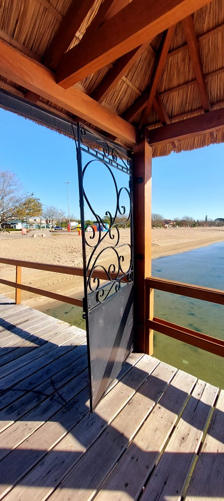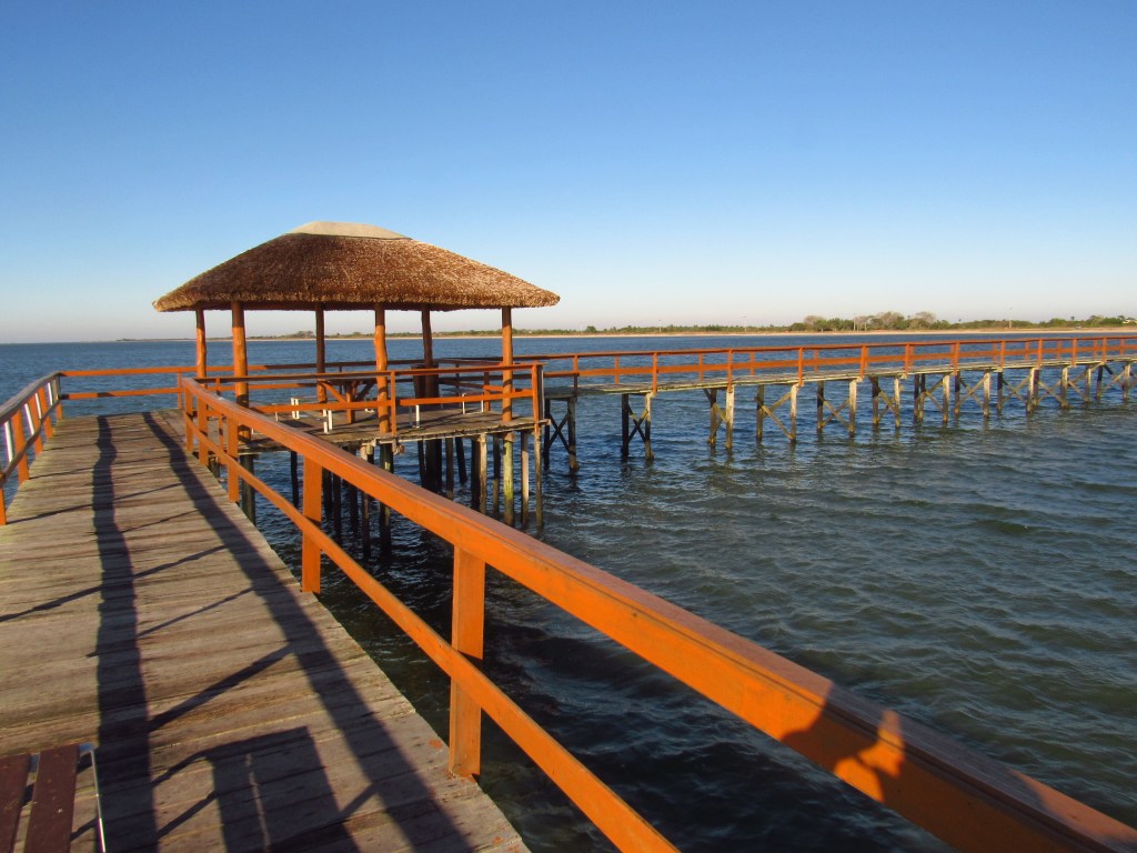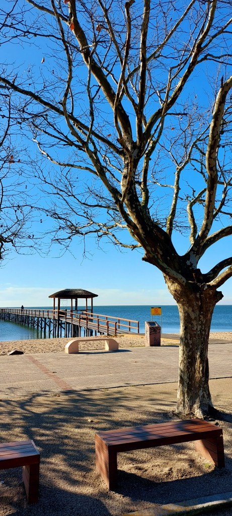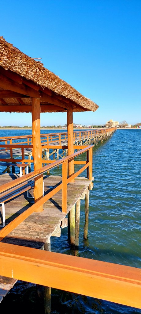 Fizemos diferente… Fomos no auge do inverno em manhã de vento frio. E fomos presenteados com sol e céu azul, como só se vê no Rio Grande do Sul. O velho trapiche está revitalizado, e caminhar por cima dele para avançar 370 metros pra dentro da água, no que é conhecido como mar de dentro, foi uma opção neste dia. E o tom esverdeado que se via na superfície combinava com o dia luminoso…