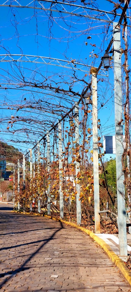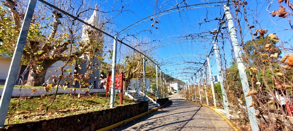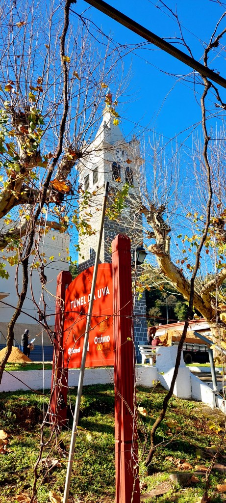 Em frente ao prédio o passeio pode ser completado em um ambiente que marca o visitante. Principalmente os que percorrem e apreciam o Túnel da Uva, formado por parreiras enfileiradas ao longo da via que corta a praça. As imagens que trazemos são de uma bela manhã de outono, quando as folhas estavam com o tradicional amarronzado da estação. A Praça também homenageia a fruta, e uma série de árvores foram plantadas e nomeadas com as cidades da região. Alguns plátanos ajudam a compor a bela paisagem que ainda tem a companhia de uma moderna igreja e seu imponente campanário erguido em 1921.