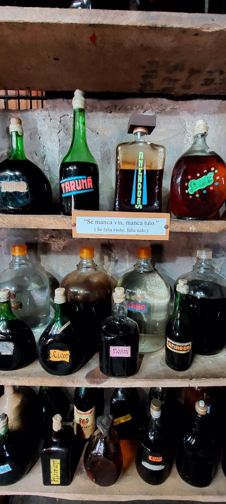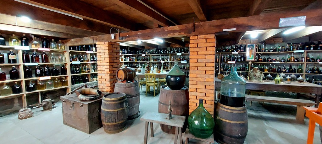 Localizada no porão da casa que abriga além do museu a sub-prefeitura do lugar, a mostra é um verdadeiro desfile de formas e cores. Mas também de frases… Em meio às inúmeras garrafas e barris não só de licores de variadas frutas, mas de vinhos, wiskis, e até mesmo graspa (espécie de aguardente feita de uva) foram colocadas inspiradas sentenças que surpreendem. Sempre fazendo referência, é claro, ao ato de beber, e por que não, se embriagar… Uma delas nos impactou, ao dizer que “Os homens e assemelham aos vinhos: a idade estraga os maus e melhora os bons.” Equipamentos utilizados na produção completam o cenário, e nos andares superiores, há mais objetos além da reprodução de um quarto de dormir e outros ambientes de uma casa antiga.