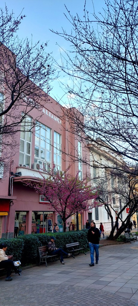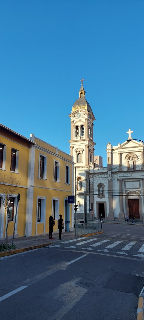 Mas é a partir da igreja, que se desvendam os prédios do centro como a antiga sede do Banco da Província, a Casa Bertani e a Casa Alegretti que também abrigou uma vinícola até os anos 1920. Outros prédios antigos como a sede do Clube Aliança ajudam a compor o entorno de um calçadão que forma um agradável ambiente para cidadãos e turistas. Afinal, ali está a La Fontana, que nada mais é do que um chafariz que jorra vinho… Tudo isso em frente ao imponente prédio da Prefeitura e perto da Casa Del Vino onde se pode obter informações turísticas.