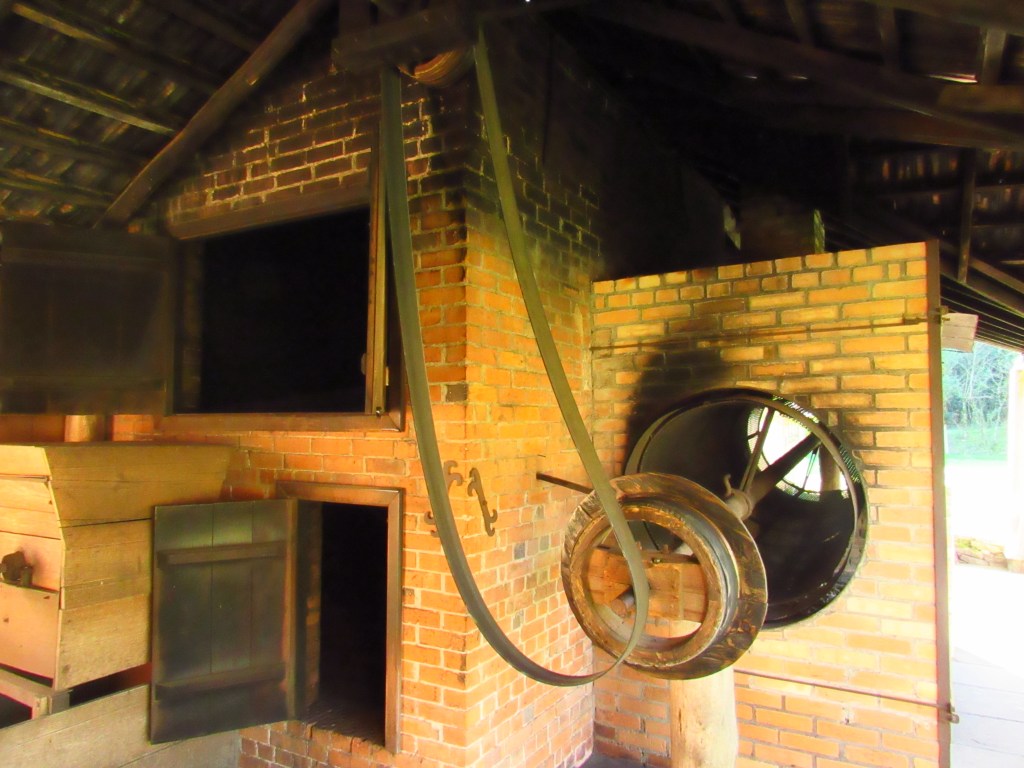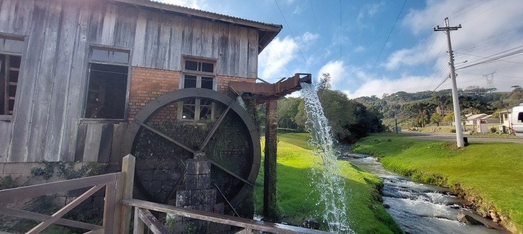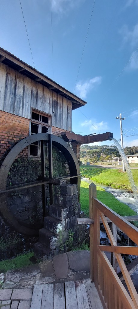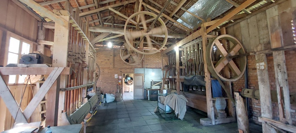 Entre as informações passadas neste instrutivo passeio, está o fato de que foram os padres jesuítas no período missioneiro que sugeriram que ao invés de mastigar as folhas, o melhor seria fazer uma infusão em água. O que deu origem a tradicional bebida… Outras etapas da preparação da erva após a colheita, também são mostradas ali. Incluindo o “barbacuá”, técnica tupi-guarani de defumação, e a “sapecagem”, ligeira queima para a secagem complementar. O processo segue com o uso de equipamentos de madeira para triturar e moer os grãos, movidos pela água que gira uma grande roda interligada com as engrenagens… A separação final de galhos maiores em uma peneira, completa o processo praticamente artesanal, que se difere do automatismo das produções contemporâneas. O barulho dos pilões batendo em máquinas dos anos 1920 e 40, parece remeter ao um tempo de desafios. Onde era preciso paciência para as coisas ficarem prontas…