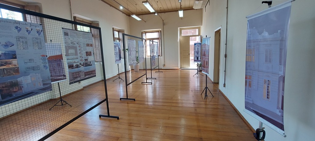 E há mais, no andar superior dedicado a exposições temporárias. Amplas salões com acesso a sacadas com vistas para a praça e a Igreja Santo Inácio de Loyola, recebem interessantes mostras, que enriquecem o histórico ambiente. Na ocasião em que estivemos ali, em Agostos de 2022, nos surpreendeu um conjunto de projetos de restauro de prédios antigos que ocupavam o espaço. Dentre eles, estava um que se referenciava a uma casa que fica do outro lado da rua…