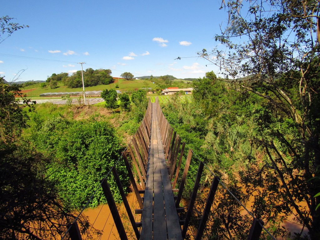 Mas é no próprio rio que nos inspiramos e passamos por experiências interessantes. Uma delas foi atravessar uma pinguela que fica a cerca de uns 20 metros acima do leito do rio, onde se passa apenas caminhando por sobre a madeira fixada em cabos de aço… O leve balançar da caminhada, de certa forma traz um ligeiro temor, sendo preciso um pouco de sangue frio para realizar a travessia…
