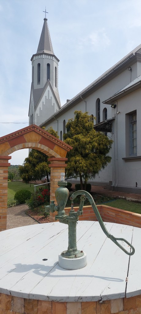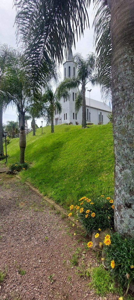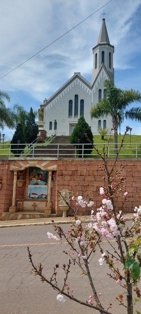Quem centraliza, como quase sempre, a zona urbana é a igreja de Santo Antônio, que não só está em um lugar alto, como possui uma estrutura interessante ao seu redor. O que cria um ambiente de acolhimento não só aos fiéis. Até mesmo uma fonte de água com situações que lembram a cultura católica, está presente contando inclusive com uma velha bomba manual. Mostrando que era dessa forma que se trazia água de poços profundos em outros tempos… Um mosaico estabelecido em um muro que se aproveita do grande desnível do terreno, mostra em azulejos a cena da própria igreja e da casa paroquial ao lado. O templo estava fechado neste dia, mas em um olhar mais atento, pudemos perceber que a estátua do santo padroeiro localizada em frente, foi erguida em 2009. Mostrando que neste novo século, o lugar segue sendo estruturado, para o exercício da fé…