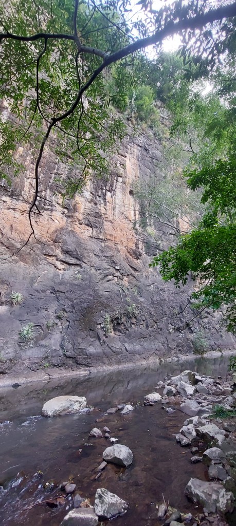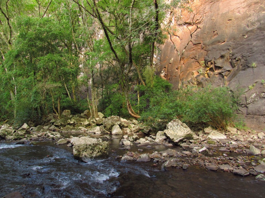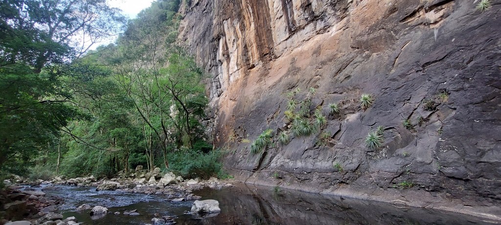 Mas o grande destaque da cidade e da região, é um imenso paredão de pedra localizado na comunidade de Alto Sampaio. Também pedindo-se permissão para entrar em uma propriedade particular, é possível chegar ao Arroio Sampaio e ver que na outra margem, há apenas uma parede natural também vertical, com mais de 100 metros de altura. Ao menos na nossa estimativa… Este arroio, que segue formando um belo vale, que já mostramos em outro conteúdo, é um lugar agradável para um bom banho em suas águas limpas. O proprietário alerta, no entanto, que algumas pequenas pedras podem se soltar de uma altura considerável e machucar algum banhista… Perigos a parte, a formação geológica impressiona e encanta, convidando a passar interessantes momentos de lazer, principalmente no verão, ou simplesmente contemplar de modo sereno, a grandiosidade da natureza…
