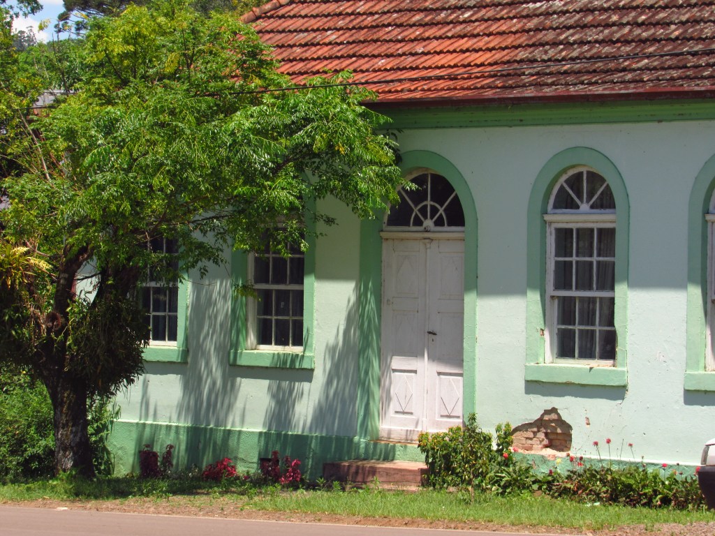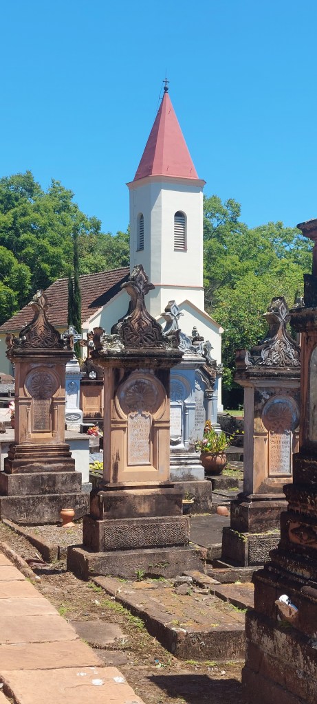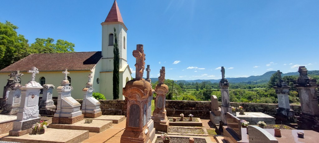 Mas é um pouco mais adiante que uma das pioneiras igrejas evangélicas do Rio Grande do Sul, se destaca na paisagem. Erguida em pedra em 1866, possui ao seu lado como sempre, um antigo cemitério onde lápides caprichosamente esculpidas são verdadeiras obras de arte. O ambiente se completa com mais flores e uma vista esplendorosa da paisagem do vale…