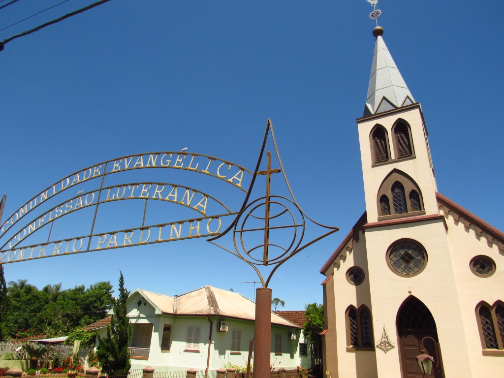 Em uma manhã de sol, passamos primeiro por uma ponte de ferro e madeira, com grossos pilares de pedra, sobre o Rio Pardinho para já iniciarmos apreciando este primeiro presente da natureza. E bem perto da ponte a igreja evangélica da comunidade dá seu cartão de visitas, com um florido e caprichado entorno…