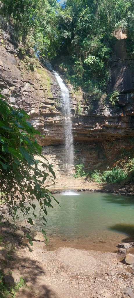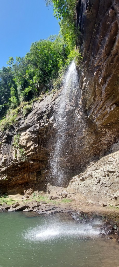Temos que confessar a bem da verdade, que um dos nossos principais objetivos era mais uma cascata que nos faltava. O verão vem chegando e a sede de água e frescor nos conduziu à Cascata dos Italianos, em Linha Caloni no interior de Igrejinha. De fácil acesso contando com uma escada de concreto para descer até lá, ela despenca de uma borda curvilínea, e é do tipo que dá para passar por trás da cortina d’água. Basta para isso, uma caminhada curta por um caminho plano, onde se pode colocar a mão na queda sem se molhar totalmente. O lago formado parece bem convidativo e seguro, já que não é grande e não deve ser muito fundo. Temos esta dúvida porque o banho, tivemos que deixar para uma próxima. Até por que, tinha muito mais a desvendar…