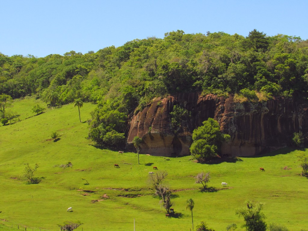 E descemos por uma estrada sinuosa visualizando a planície que envolve o Rio da Ilha, já no município de Taquara. E aí começaram a aparecer outras surpresas que premiam quem anda por aí… A começar por um paredão de pedra muito interessante que se enxerga da estrada. Ele tem um nome? Quem sabe uma história ou lenda? Ou mesmo já é uma atração e não conseguimos descobrir…