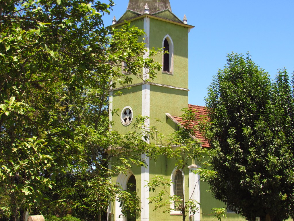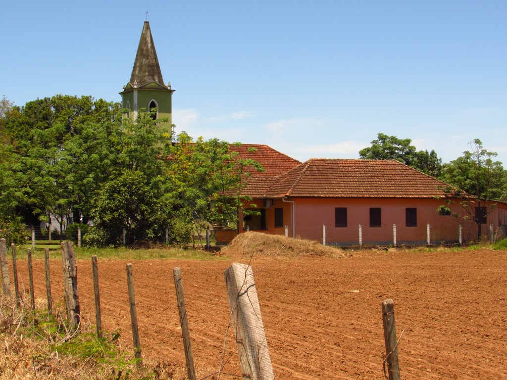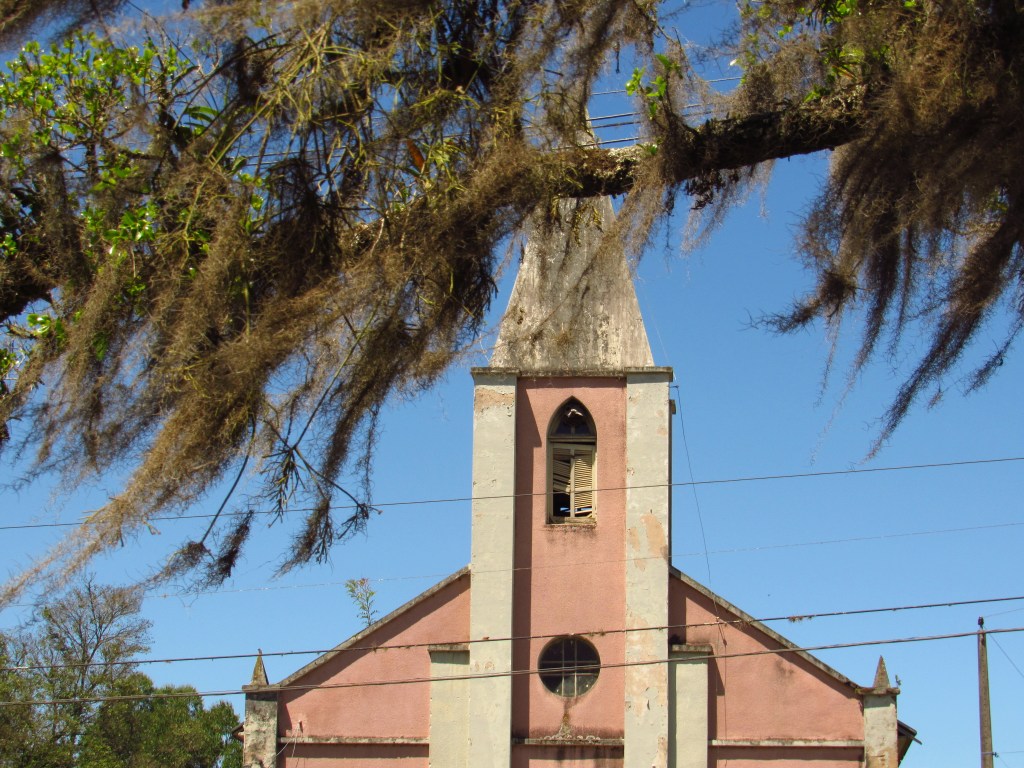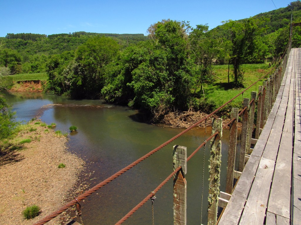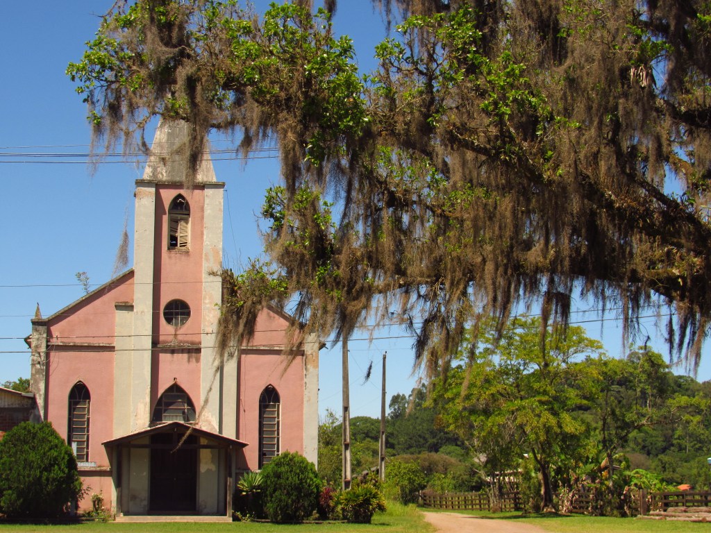 Fechamos a conta deste roteiro em uma antiga ponte de ferro e madeira, sobre o Rio Rolante, afluente do Sinos. E ficamos na dúvida se era possível passar de carro, mas o caminhão que a cruzou em seguida, logo nos trouxe a resposta. Sua altura impressiona, assim como o fato de ela possuir perigosas aberturas… Ali perto uma singela igreja evangélica aumenta a nossa coleção, completando um belo cenário ao lado de uma extensa planície…