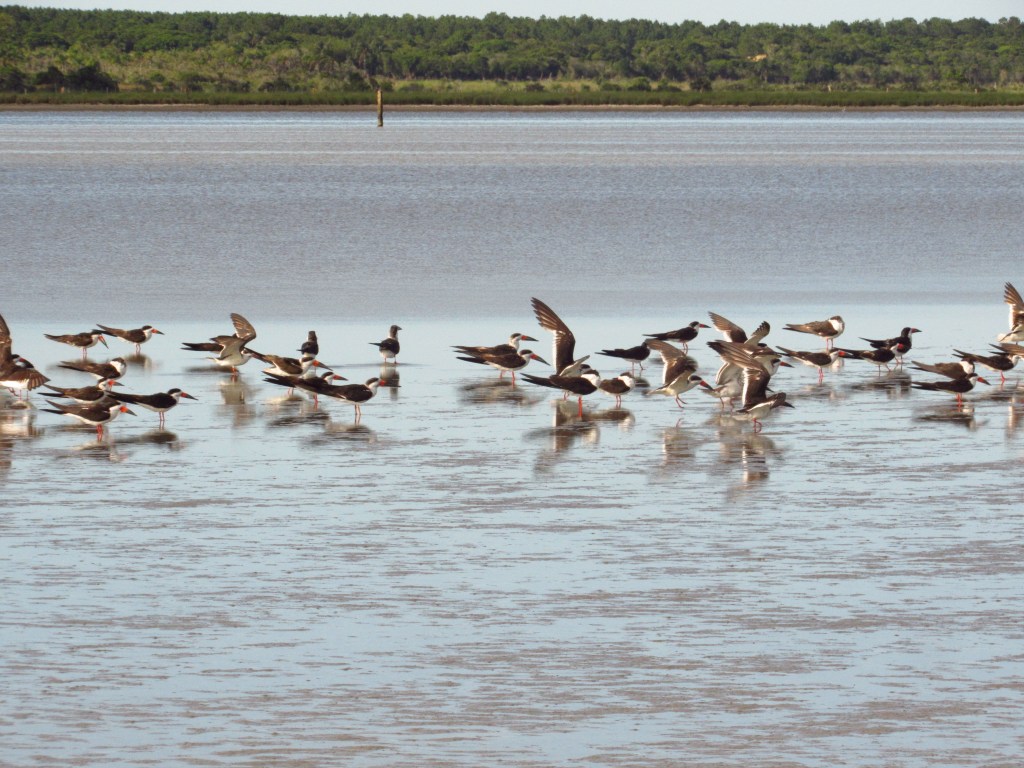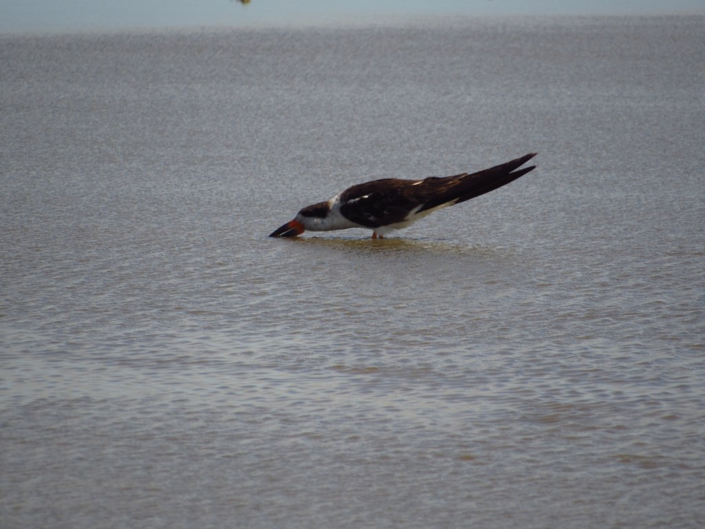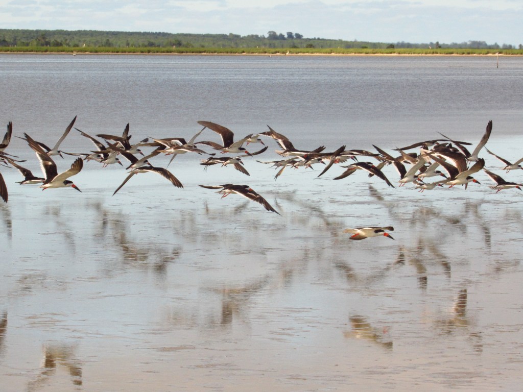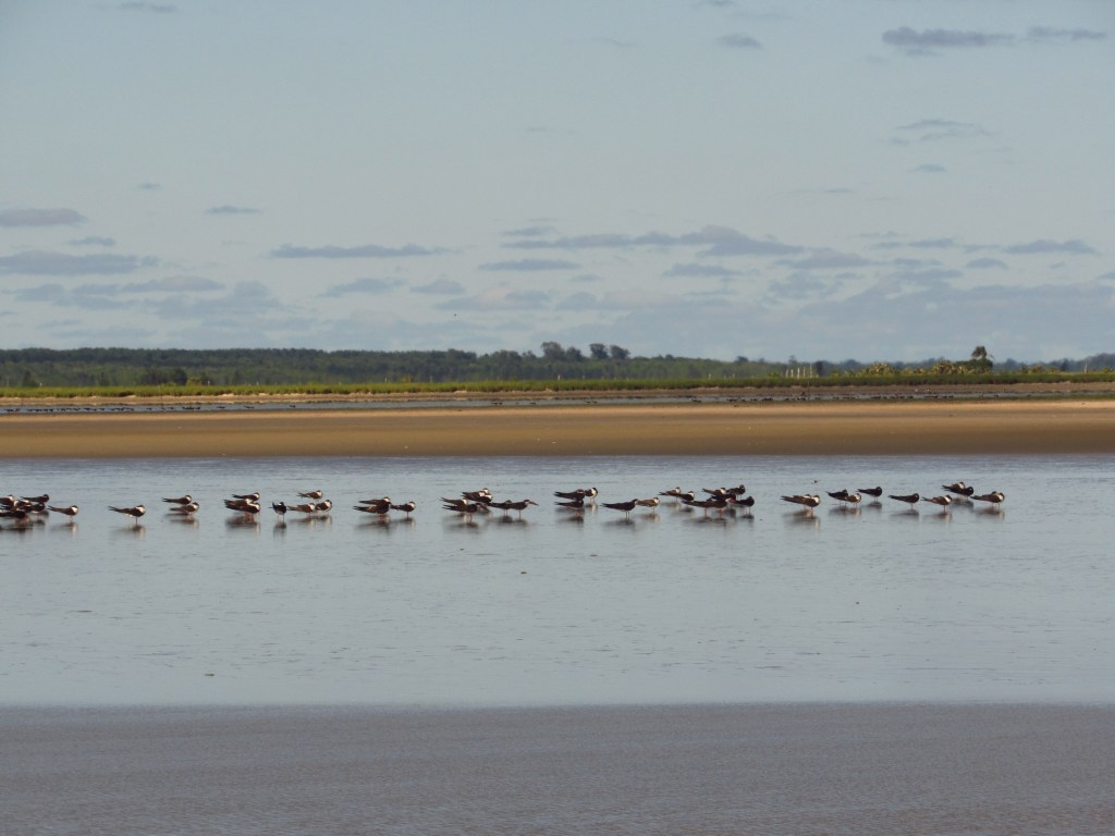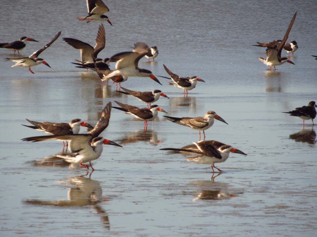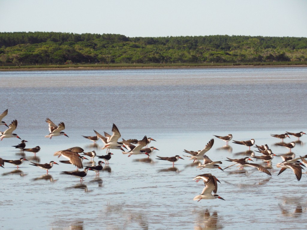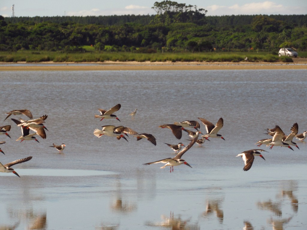 Mas a grande atração desta tarde memorável, foram os grupos de uma espécie chamada popularmente de Talha-Mar. Esta ave média de plumagem preta e branca, dá nome a uma outra trilha que mostramos no primeiro conteúdo desta séria, mas eles não estavam naquele ponto que tínhamos ido de manhã. O seu nome diz respeito ao fato de o seu bico relativamente grande para o seu tamanho, ser usado para “rasgar” a superfície da água, em busca de algo interessante para saciar sua fome… E não só sua presença em grande número nos chamou atenção, como as espetaculares revoadas que foram proporcionadas. Ver pequenas multidões alçando voo é algo para se guardar para sempre na memória…