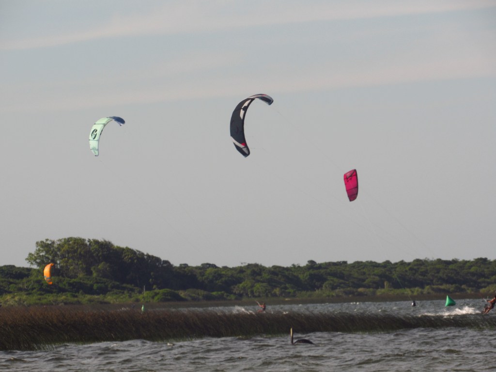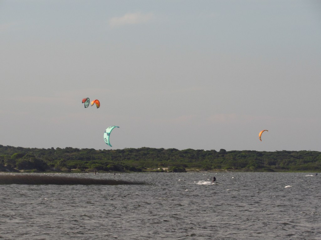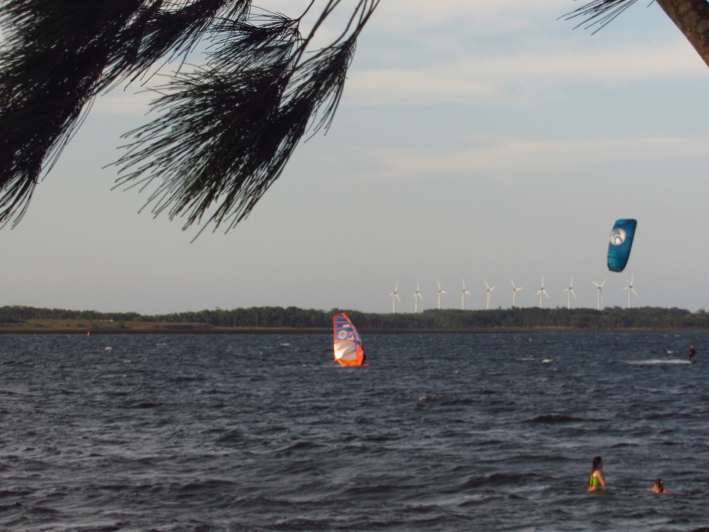 Nesta nossa visita optamos por apenas finalizar uma tarde de sol e de muito vento, que impulsionaram as velas dos KiteSurf (Falamos de forma ERRADA no vídeo ao chamar de PARAGLIDER). Com o colorido delas enfeitando a paisagem e fazendo a felicidade dos praticantes deste esporte radical. Já na linha do horizonte de quem olha da margem “urbana” na direção leste, altos “cataventos” giravam ao sabor deste mesmo vento forte, gerando eletricidade a partir da energia eólica…