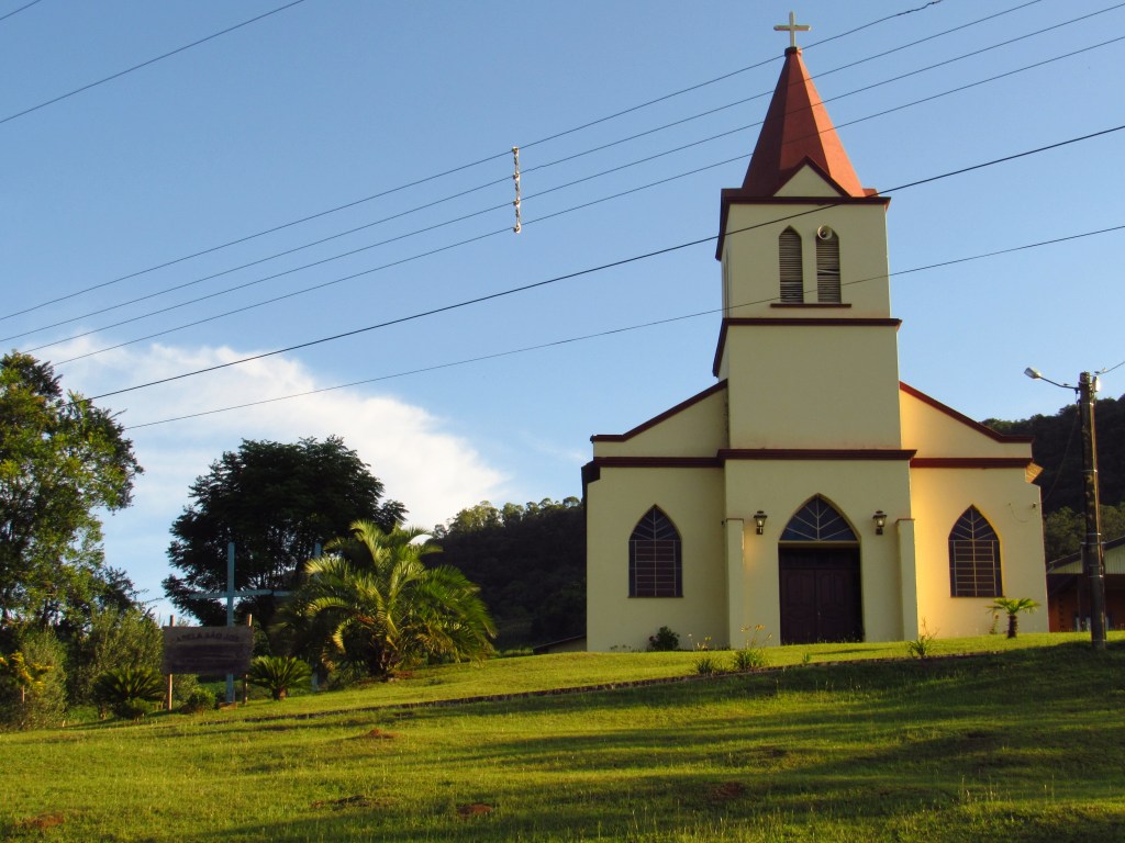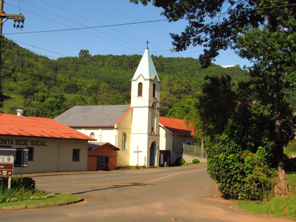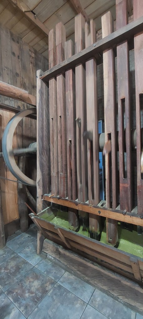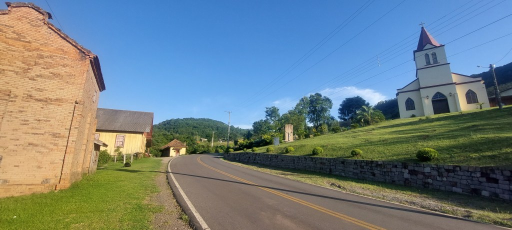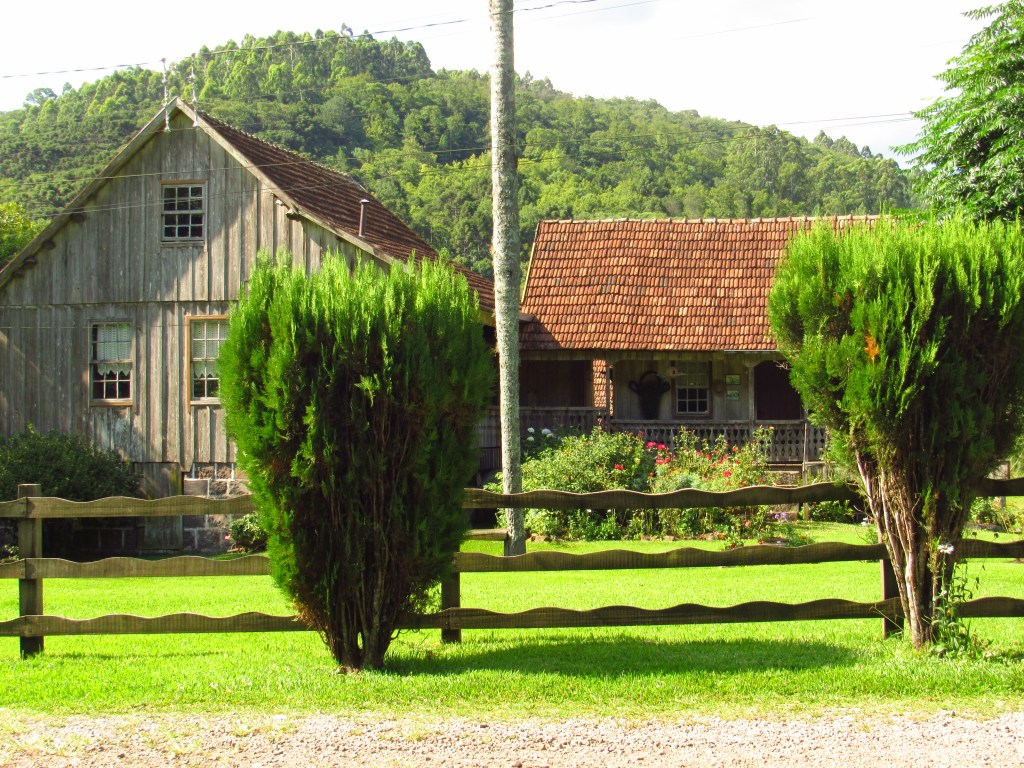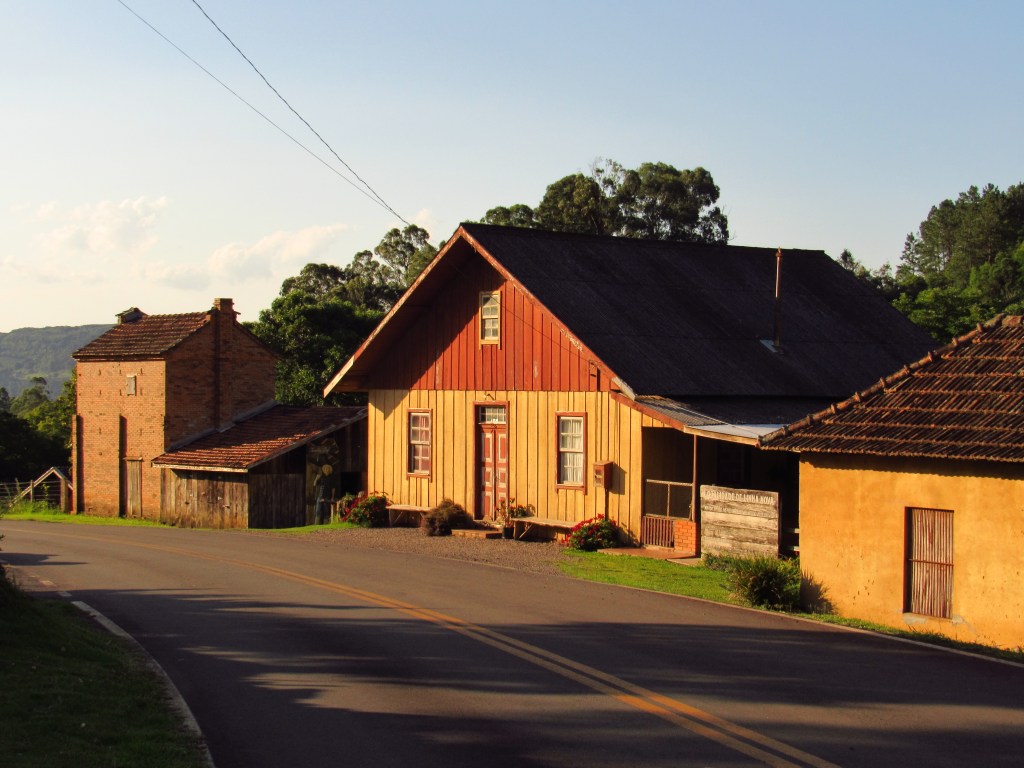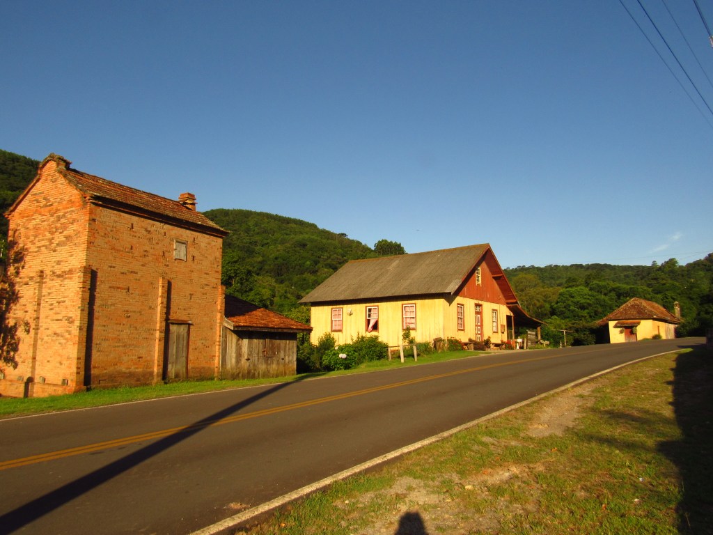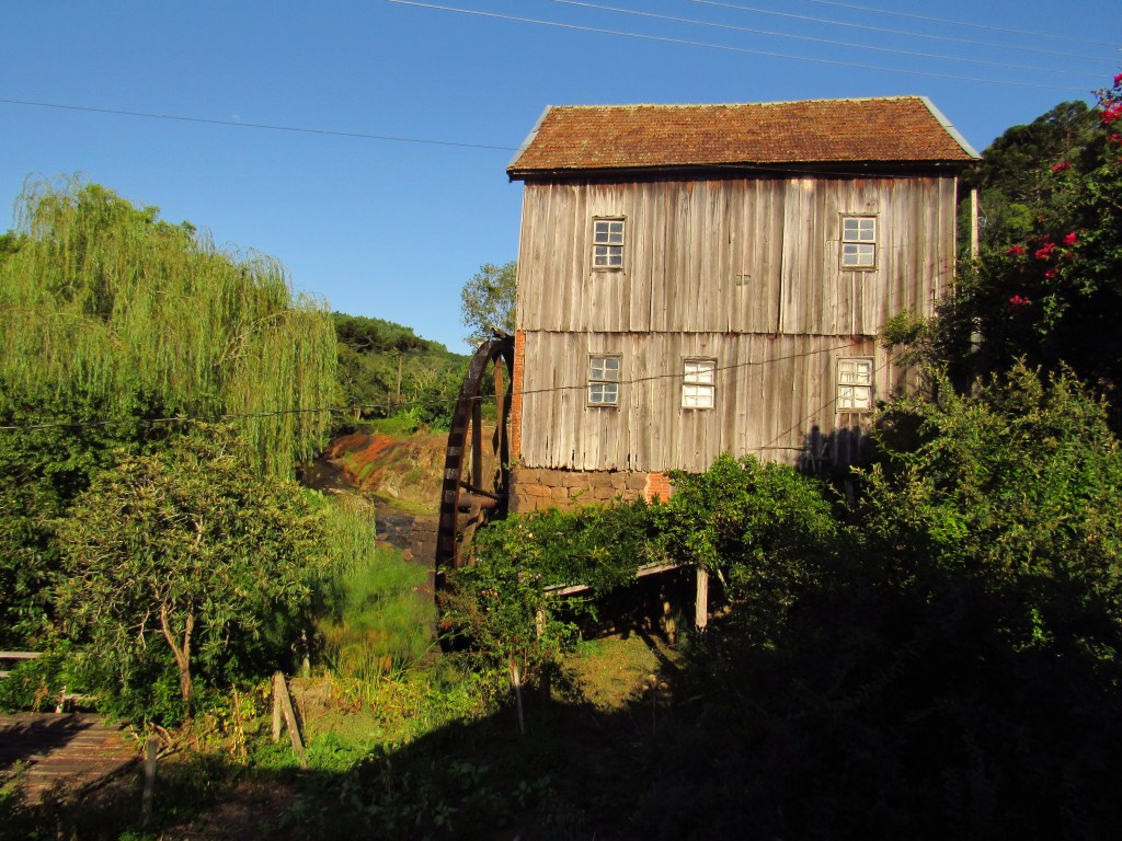 Fizemos uma rápida passagem por alguns pontos de um roteiro onde turistas partem da cidade e percorrem empreendimentos recheados de história, de um passado de trabalho na produção rural e em uma incipiente indústria… E é claro que ficou aquela vontade de voltar com mais calma… Em Linha Bonita a Casa Centenária da família Ferrari foi admirada por fora, em seus belos lambrequins de madeira ao melhor estilo dos imigrantes italianos. Um pouco adiante ao lado da singela igreja de Santo Pedro, está o Moinho Cavichion datado de 1920, com sua grande roda d´água a girar, como muitos outros que já mostramos por aqui. Logo ali na frente na Ervateira Marcon foi possível fazer uma rápida visita e conhecer métodos antigos de moagem da base do nosso chimarrão…