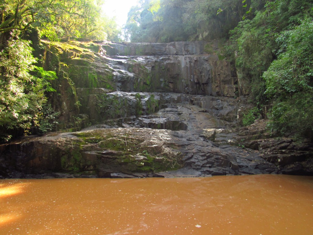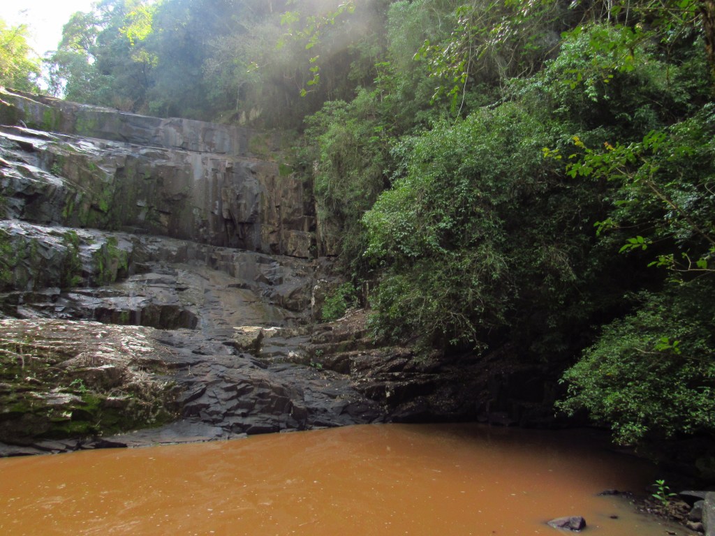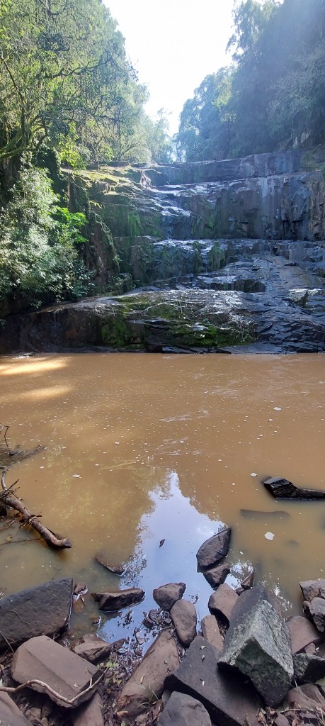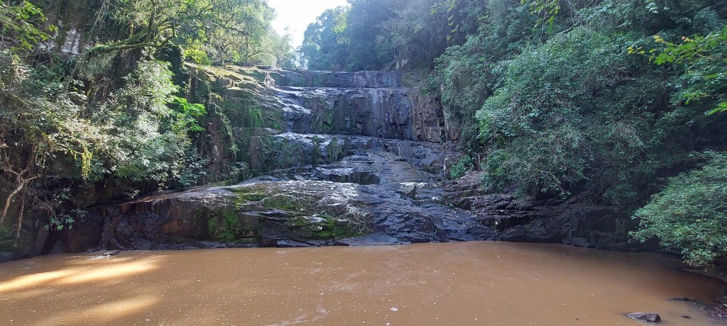 Alguns passos acompanhando um leito de pedras, e finalmente chegamos à visão impressionante de uma queda de belas formas, mas totalmente seca. Até havia um pequeno fiapo de água, para ser sincero… A estiagem castigou este espetáculo da natureza, que vimos em outros conteúdos postados na internet. Ficou a vontade de voltar e fazer pessoalmente esta comparação e conversar com os proprietários que buscam valorizar aquilo que tem, sendo também receptivos com os visitantes. Sempre é necessário lembrar é claro, que devemos respeitar estes lugares, cuidando o máximo possível quando da nossa passagem por lá. Com certeza a natureza agradecerá.