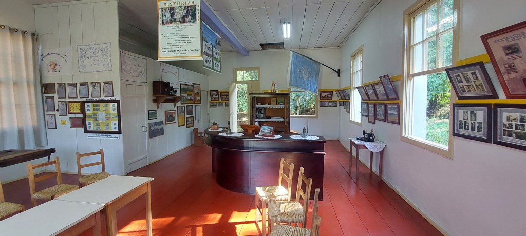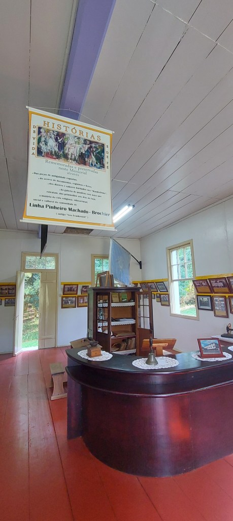 No dia desta visita tivemos uma agradável e muito interessante conversa com o senhor Rubio Kleber que estudou nos anos 1950, e de aulas neste lugar entre 1966 e 67. A escola então mantida pela Igreja Luterana, cujo prédio de 1958 fica perto dali, seguiu até 1971, quando se estabelece uma escola estadual na região. E por iniciativa de Rubio, o prédio foi reaberto em 2011, como sede de um memorial onde se destacam objetos que fizeram parte da rotina de outros tempos, além de várias fotos antigas…