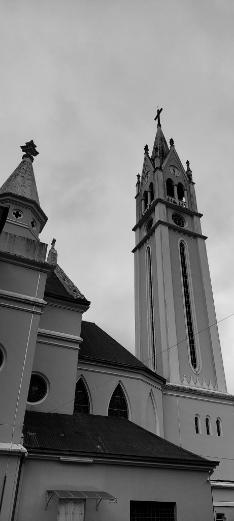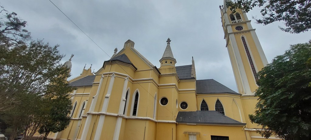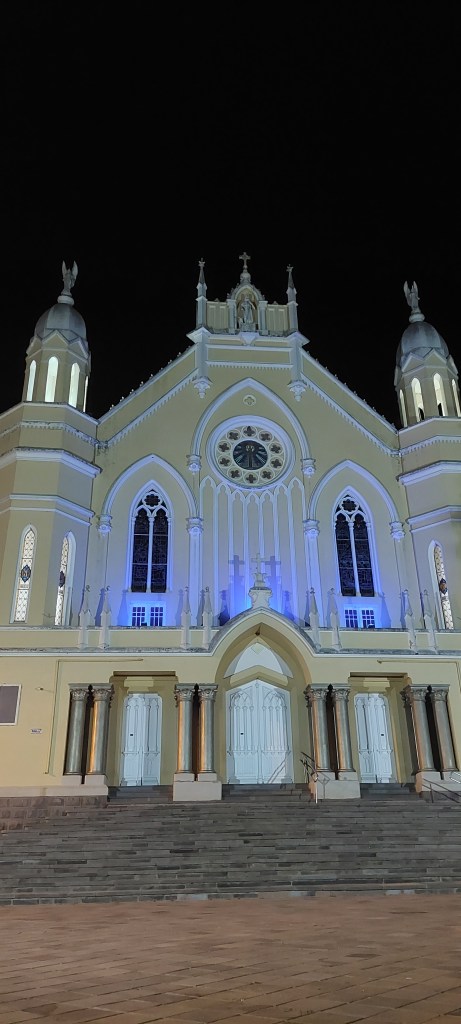 E é claro que o basalto está presente em várias destas construções, e também na praça central, onde um painel com imagens formadas com pedras deste material formam figuras que remetem aos duros tempos da colonização. Há painéis semelhantes nas entradas da zona urbana que ajudam também a caracterizar a cidade como a capital nacional do basalto…