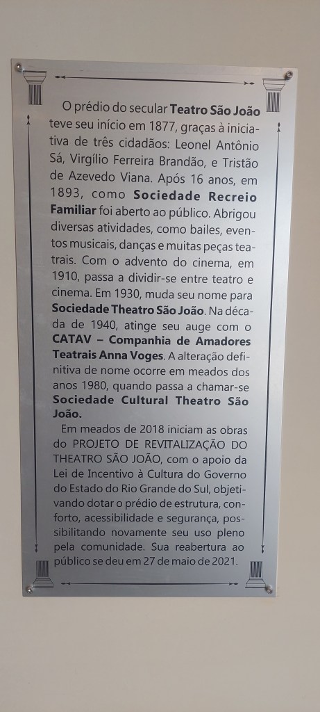 É longa a história da cidade de Taquari, às margens do rio de mesmo nome, e é marcante o patrimônio histórico do lugar fundado por imigrantes açorianos. E um dos ícones desta trajetória, é o Theatro São João (assim mesmo com “th”), erguido em 1893. E em seus 130 anos de existência está tinindo de novo, e conta agora com a companhia de um belo memorial. Que de certa forma o aproxima ainda mais, da bela paisagem da Lagoa Armênia.