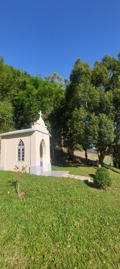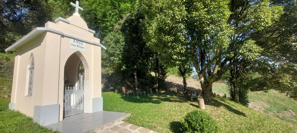 E como sempre a fé da comunidade se manifesta de diversas formas, incluindo pequenos capitéis, que é como são chamadas construções de pequeno porte par abrigar imagens de santos, comuns na beira de estradas… Esta foi à vez de pararmos em um deles dedicado a São Roque erguido em 1932, de frente para mais uma paisagem interessante, com direito a bancos em baixo de árvores para admirá-la…